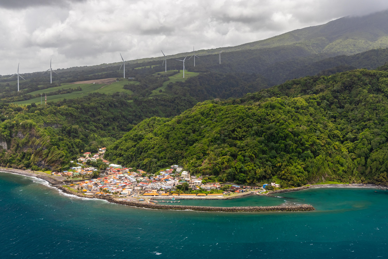 The commune of Grand'Rivière extends in the eponymous valley at the foot of Mount Pelée, at the northeastern end of Martinique. It is also the furthest commune from the island's capital. The road to get there goes deep into the tropical forest, crosses ravines, and skirts cliffs, and it takes at least 1h30 to cover the 44 miles (72 km) that separate this municipality of the Bout du Bout (the very very end) from Fort-de-France. It is also in the heart of the village, founded by the Jesuits at the end of the 17th century on the left bank of the Grande-Rivière, that the North-Atlantic road ends. Today, this fishing village of only 531 inhabitants is the least populated commune of Martinique. Since 2018, Grand'Rivière has hosted on its territory the largest wind farm in the Lesser Antilles, consisting of seven wind turbines supplying 1,500 homes.