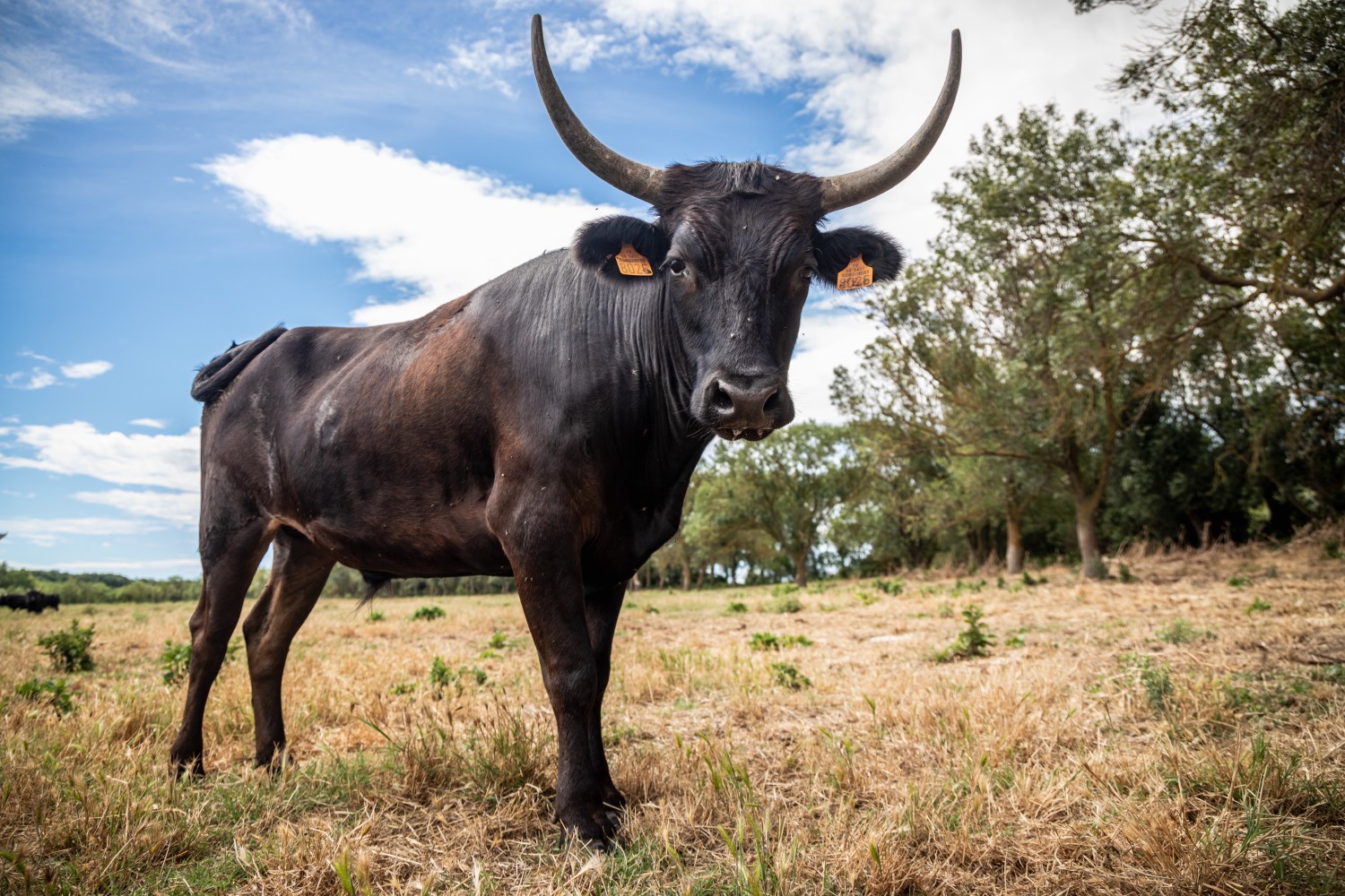 The biòu or Camargue bull is an animal still considered wild and the only European breed, therefore, qualified as a brave breed. This fiery and indomitable animal is recognizable by its shiny black coat and its horns in the shape of a lyre or raised goblet. While the Camargue bull is generally quite large in size, it is, however, a relatively light animal and weighs between 550 and 880 pounds (250 and 400 kg), which gives it ideal aptitudes for racing. A true emblem of the Camargue region, the biòu is at the heart of many local traditions like Camargue races, the abrivado, or the bandido, an event during which wild bulls cross towns and villages supervised by herdsmen on horseback.