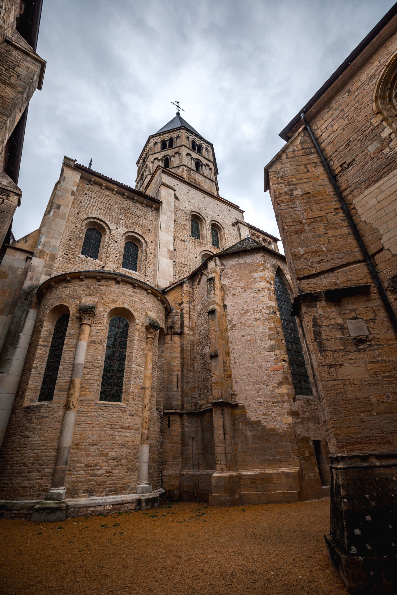Of the abbey of Cluny, largely destroyed between 1798 and 1823 after being sold as national property, the south cross-brace of the great transept visible here still remains today. The church dedicated to Saint Peter and Saint Paul, whose solemn dedication was celebrated by Pope Innocent II on October 25, 1130, had an apse with an ambulatory and five radiating chapels preceded by two transepts flanked by chapels and separated by a choir. Four bell towers, of which the octagonal Eau Bénite (Holy Water) bell tower remains, crowned the crossings of the transepts and the two arms of the great transept.
