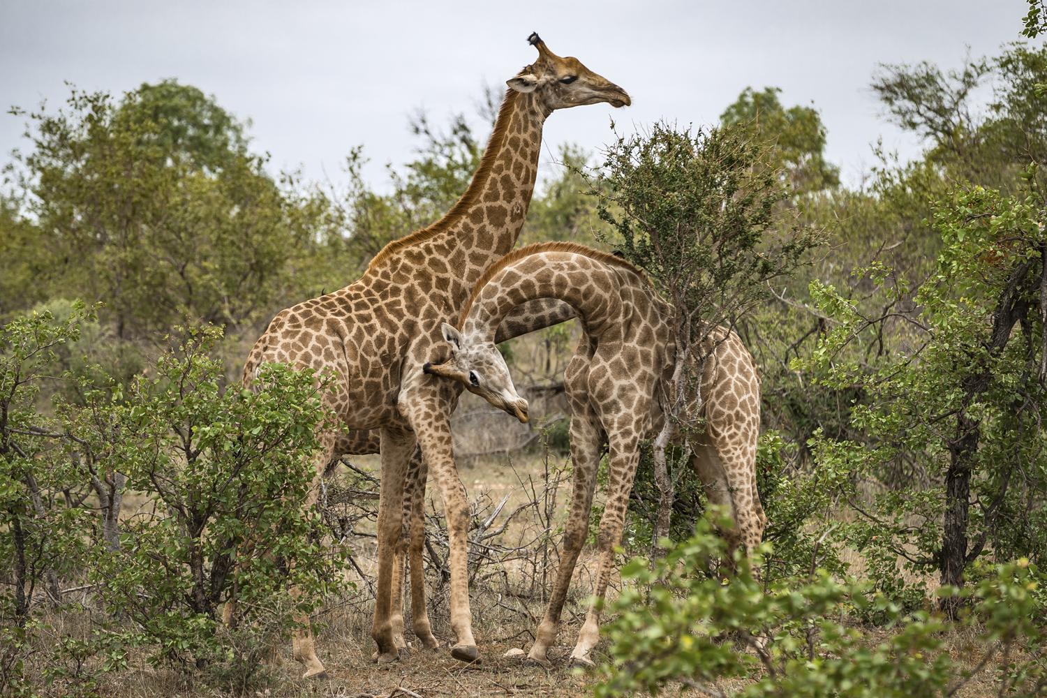 The careful and simultaneous observation of the two giraffes in this photo confirms that each giraffe has a coat with unique patterns of its own, like the fingerprints in humans. These patches or spots not only serve as camouflage but are individually surrounded by a very elaborate system of blood vessels which functions as a thermal window helping to regulate its body temperature.