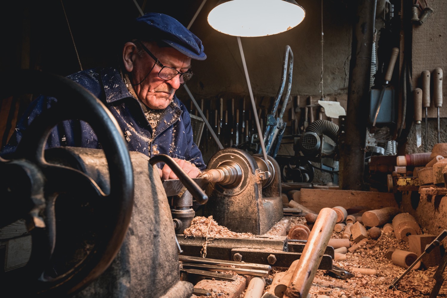 Several little-known trades are linked to the art of woodworking and wooden toys for which Jura is famous. There is that of wood turner - like here Robert Marichy - who shapes his pieces on a lathe but also that of ‘tabletier’, specialized in the manufacture of checkerboard or chessboard supports and pieces, or even that of ‘layetier’, who more specifically manufactures wooden chests and crates.