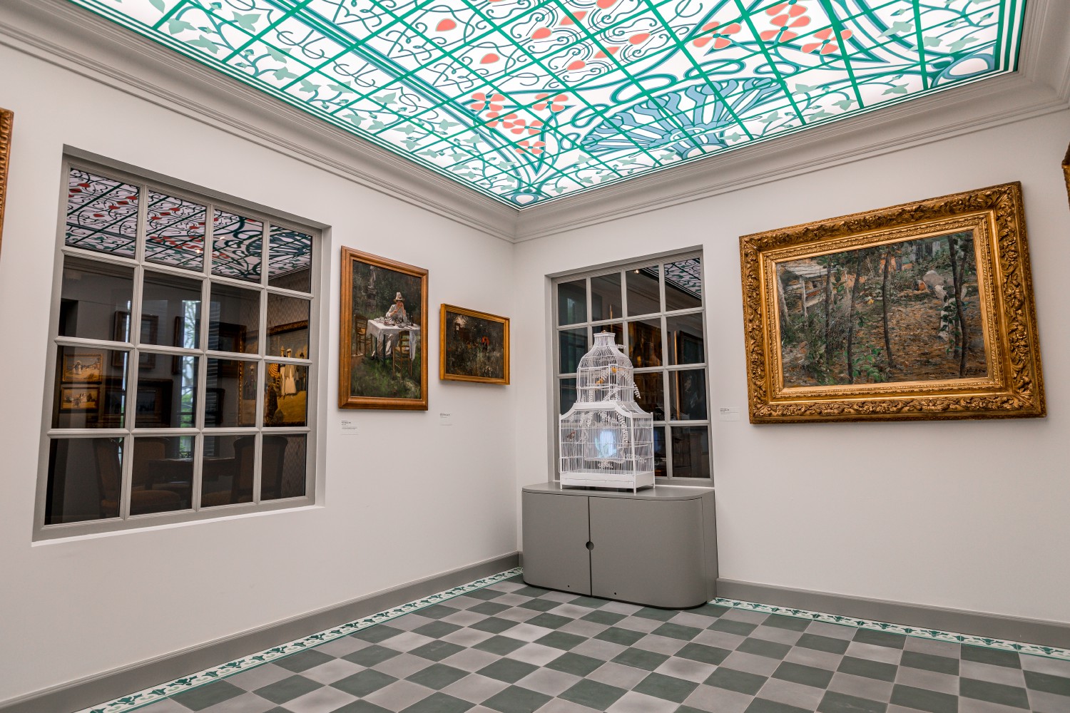 The winter garden of the Villa du Temps Retrouvé in Cabourg in the Calvados department serves as an exhibition space for various works, in particular by René-Xavier Prinet, Gaston Roullet, and Jacques-Emile Blanche. It also houses a cage apparently used by Gaston Balthazar Velle (1868-1953) in his early 20th-century films. Its very bright and colorful Art Deco style ceiling is considered remarkable by art specialists.