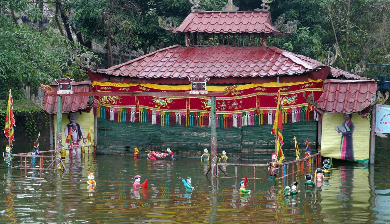 Ce théatre un peu rustique, dans les jardins du Musée d'ethnographie vietnamienne, présentait un spectacle de marionnettes aquatiques. L'histoire raconte celle d'un prince qui finira par épouser une pauvre paysanne, et les nombreux tableaux présentent tour à tour le travail des champs, la mousson, la cour du prince, une bataille navale, etc. Les marionnettes sont actionnées par des acteurs en cuissardes situés derrière la persienne, accompagné par quelques musiciens traditionnels.