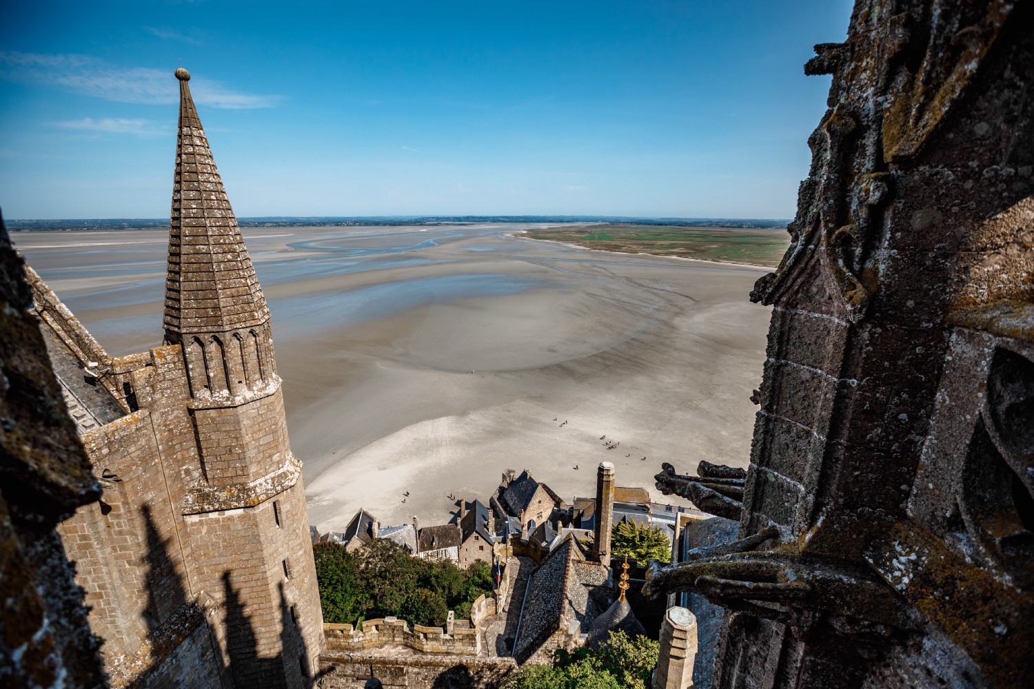 The higher you climb the towers of the abbey church of Mont-Saint-Michel, the more you discover the immensity of the bay. Low tide reinforces this impression and the abbey becomes like a lighthouse resisting all storms. Seen from the coast, the bay looks like a vast flat expanse. But it is an illusion! Three coastal rivers – the Sée, the Sélune, and the Couesnon – wander through it, carving out new channels every day that isolate the sandbanks. In the distance, the polders alternate between high undulating grass and pools of shining water.