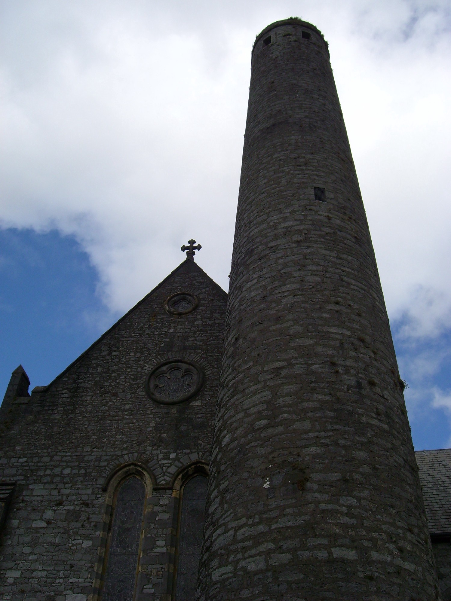 Sur le site se trouvait probablement une première église de bois, remplacée à la fin du Moyen Âge par une église en pierre de style roman. L'imposante cathédrale médiévale actuelle a remplacée cette première église. A proximité de la branche sud du transept se dresse une tour ronde de 30 m datée du 9ème siècle. Son sommet est accessible par un ensemble d’échelles à l’intérieur et offre une bonne vue de Kilkenny et la campagne environnante ; elle a peut-être été à la fois tour de guet et refuge.
