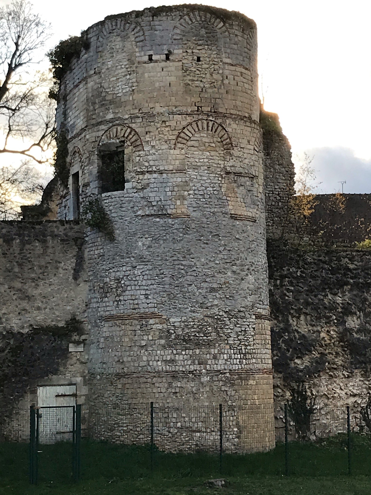 Tour des Gardes et murets de la salle des Maréchaux depuis le jardin du Roy. Remparts de Senlis ( Oise).
