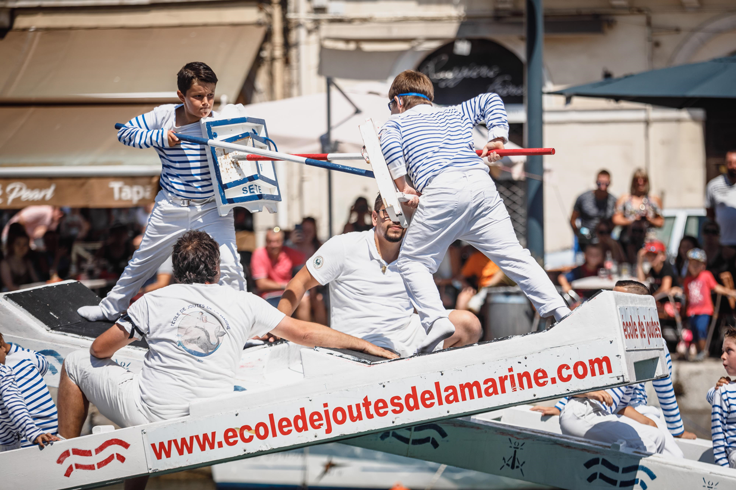 In the city of Sète, in the Hérault department, nautical jousting holds an essential place at the heart of the local traditions. This traditional sport, formalized in 1666 following the creation of the port, participates in the renown of Sète. Perched on tintaines (platforms attached above the water) on their respective boats, two jousters compete in an attempt to push their opponent overboard with a spear. The tintaines are equipped with toe clips to resist the impact of the opposing spear. For 45 years, the jousting school of the Marine of Sète has been responsible for training young local amateurs through initiations in traditional Languedoc jousting.