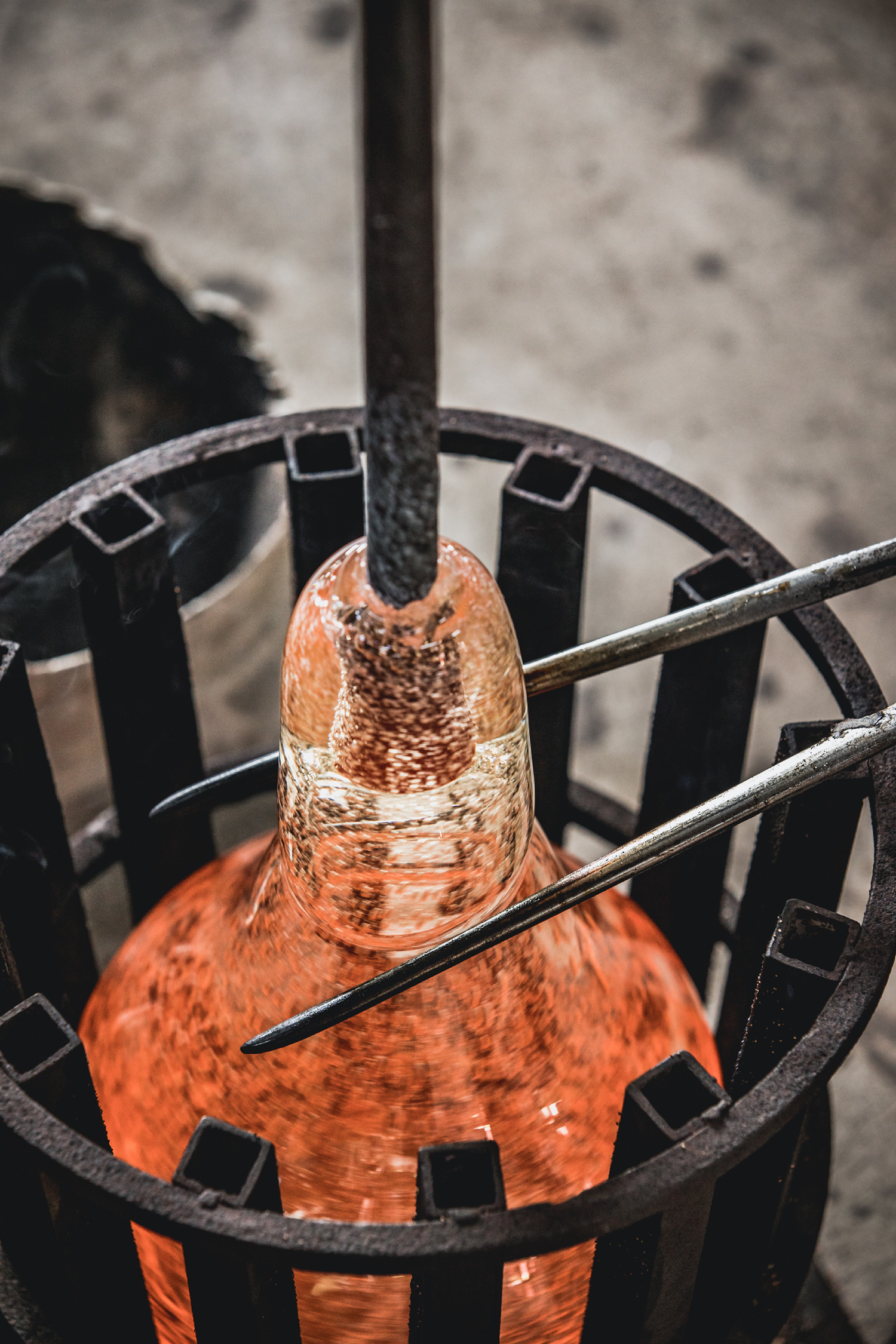The silica (sand) at the base of glass formation must be heated over 3,092°F (1,700°C) to melt. Fluxes (soda, potash, or lime), water, and recycled glass debris (cullet) are then added in order to facilitate its transformation. Different additives are also inserted depending on the subsequent use of the finished product such as magnesium oxide to make the glass more resistant or iron oxide to give it a greenish tint. The sandy mixture is then heated at about 2,732°F (1,500°C) in a furnace to turn into liquid glass.