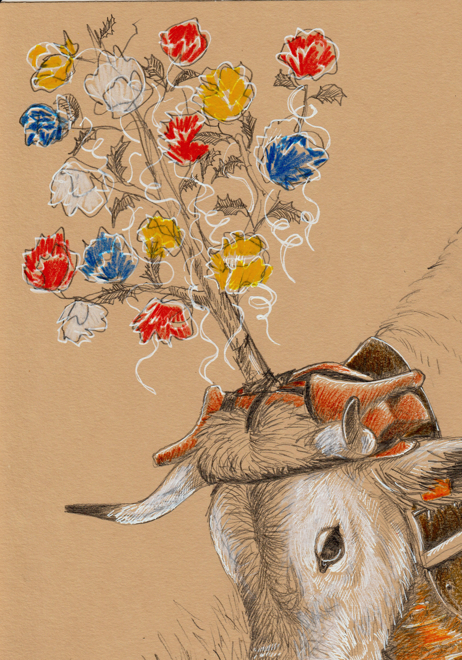 Pendant la transhumance, petite pause ravitaillement pour reprendre des forces et faire les 15 ou 20 km (parfois plus) jusqu'aux hauts paturages du plateau de l'Aubrac.
