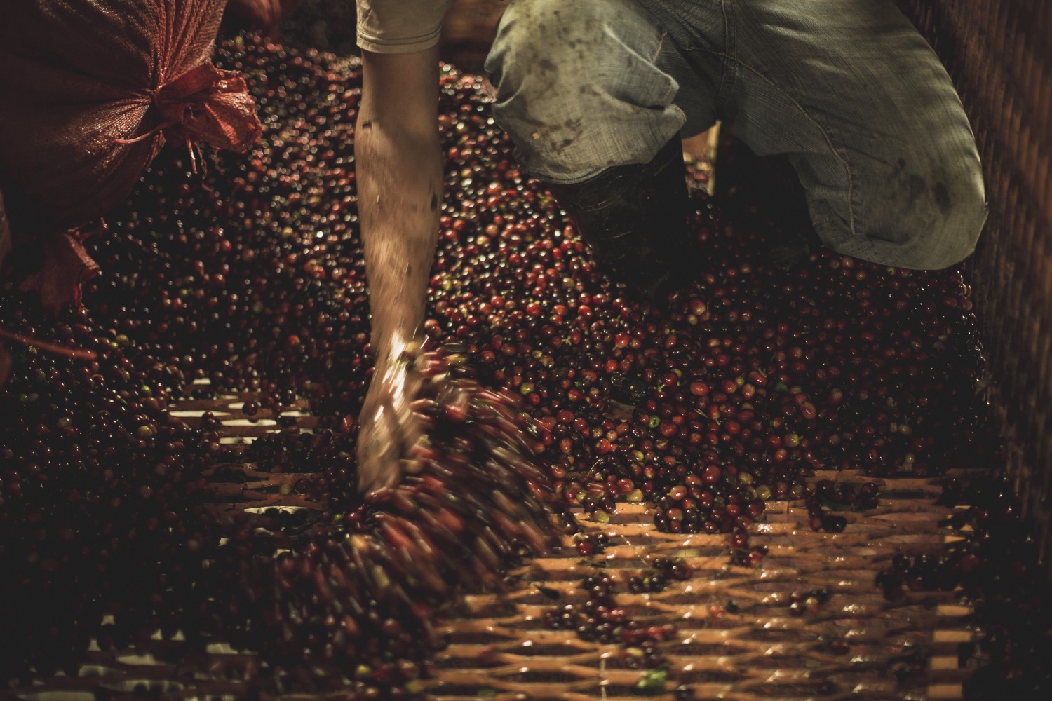 After the harvest, bags of coffee cherries are brought to the cooperative for processing. They are first passed through a grid to filter branches and leaves, before undergoing a complex process of pulping, fermentation, washing and drying that will extract the beans.