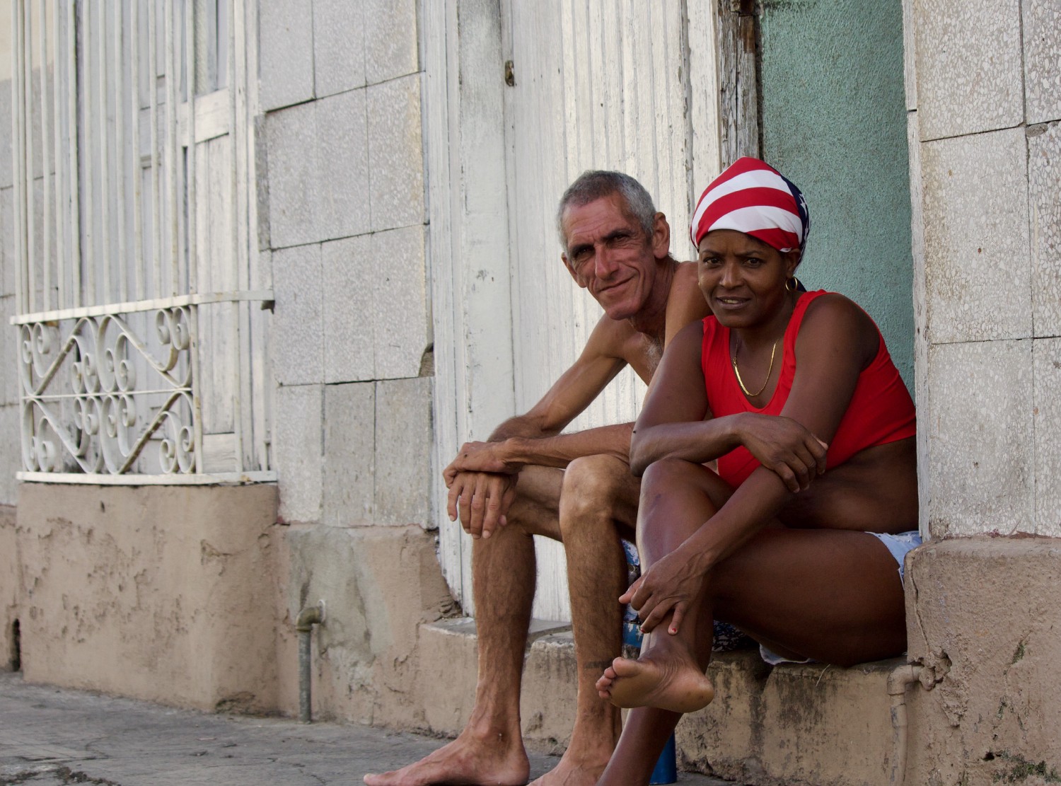 Typical Cuban street view of a typical Cuban couple. A symbol of the hate-love relationship between Cuba and America is the handkerchief made from the American flag.