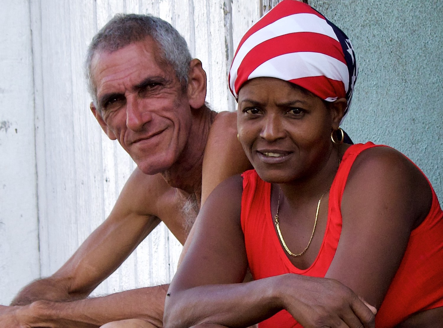 Typical Cuban street view of a typical Cuban couple. A symbol of the hate-love relationship between Cuba and America is the handkerchief made from the American flag.