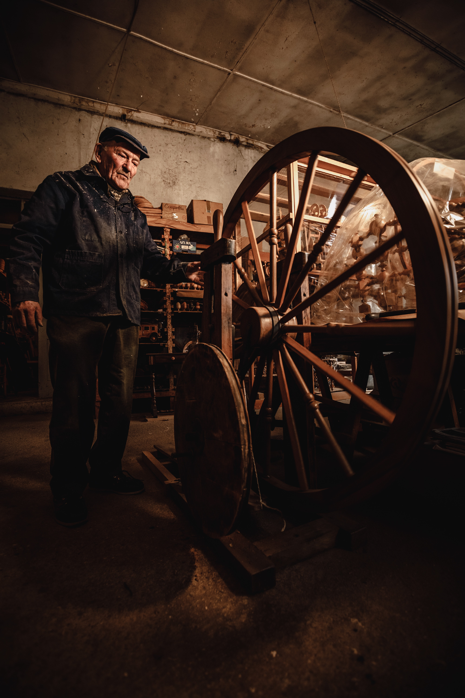 The ancient Egyptians and Romans already turned wood with machines operated by two persons. The arrival of the connecting rod and the crank in the 5th century brought rotation by pedal, a process similar to the first sewing machines. The use of the motive force of water was operated using the paddle wheels of a mill. In the 19th century, the wheels that powered the wood lathes were the size of a wheelwright's wheel and were fixed to the ceiling. They were later replaced by smaller cast-iron wheels with the arrival of electric engines.