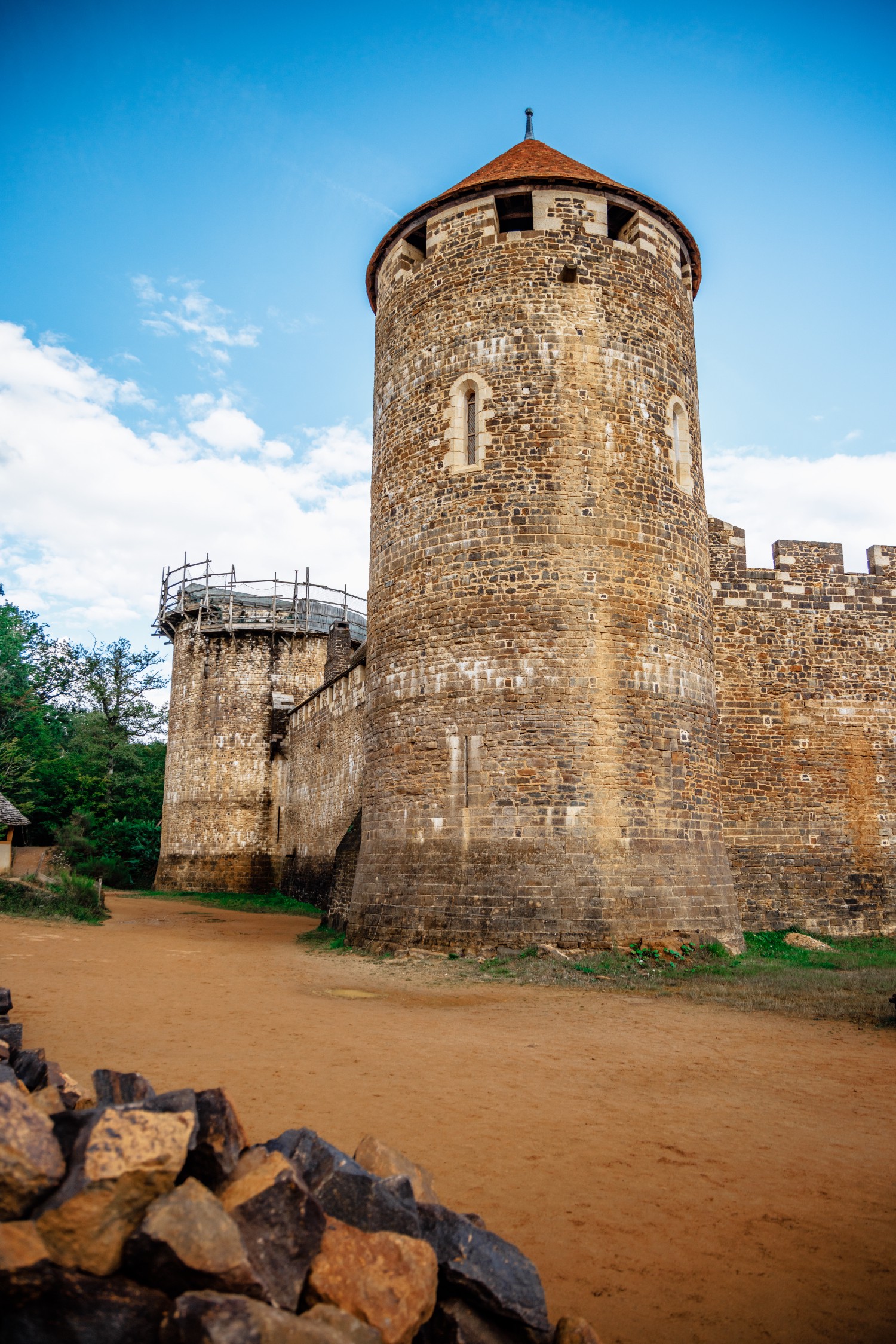 The archetype of the so-called Philippian castles - i.e. which follow the castral model of Philippe II Auguste (King of France from 1180-1223) such as the castle under construction at Guédelon - takes the form of a fortress with a rectangular enclosure. It has various recurring characteristics, such as towers at the corners and at the curtain walls, dwellings and services organized along the enclosure, a door arranged between two towers in the middle of a curtain wall, and a master tower. A key element, the master tower either stands in the center of the ensemble or, more frequently, at the corner of two curtain walls. The castles of the Louvre and Dourdan, respectively built in the 1190s and 1220s, were the most dynamic vectors for the dissemination of this regular rectangular scheme to the four corners of the territory leading to both a defensive and symbolic normalization.