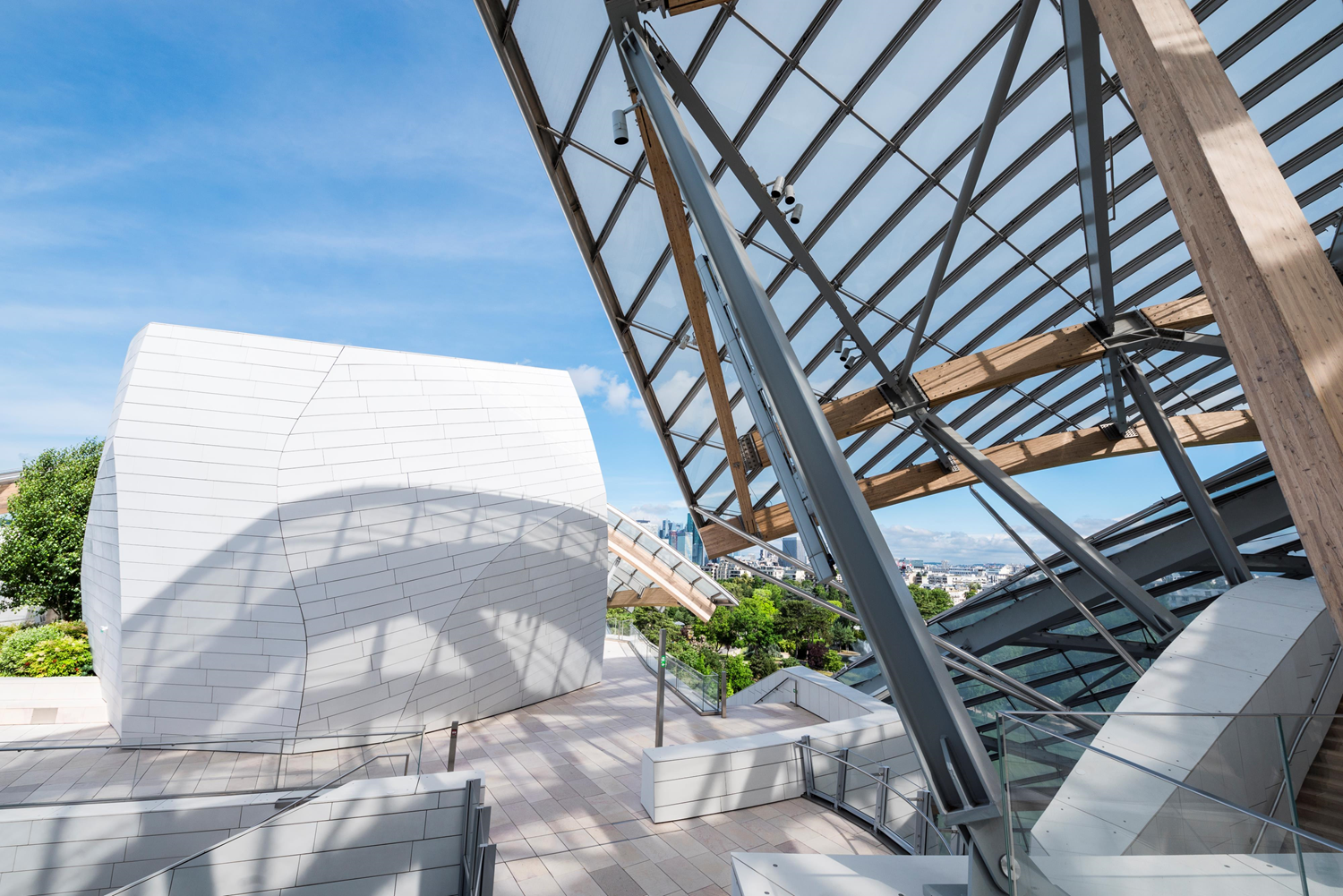 Frank Gehry is a specialist in designing unconventional buildings with often titanic dimensions, such as the Fondation Louis Vuitton in Paris. The complex's 145,313 sq feet (13,500 m²) glass sails surround blocks covered with 19,000 ductal plates (white fiber-reinforced concrete). The building rises to more than 131 ft (40 m) in height and overlooks the Bois de Boulogne and the Jardin d'Acclimatation to which it gives access. The Fondation Louis Vuitton's eleven exhibition galleries offer 41,440 sq feet (3,850 m²) of museum spaces.