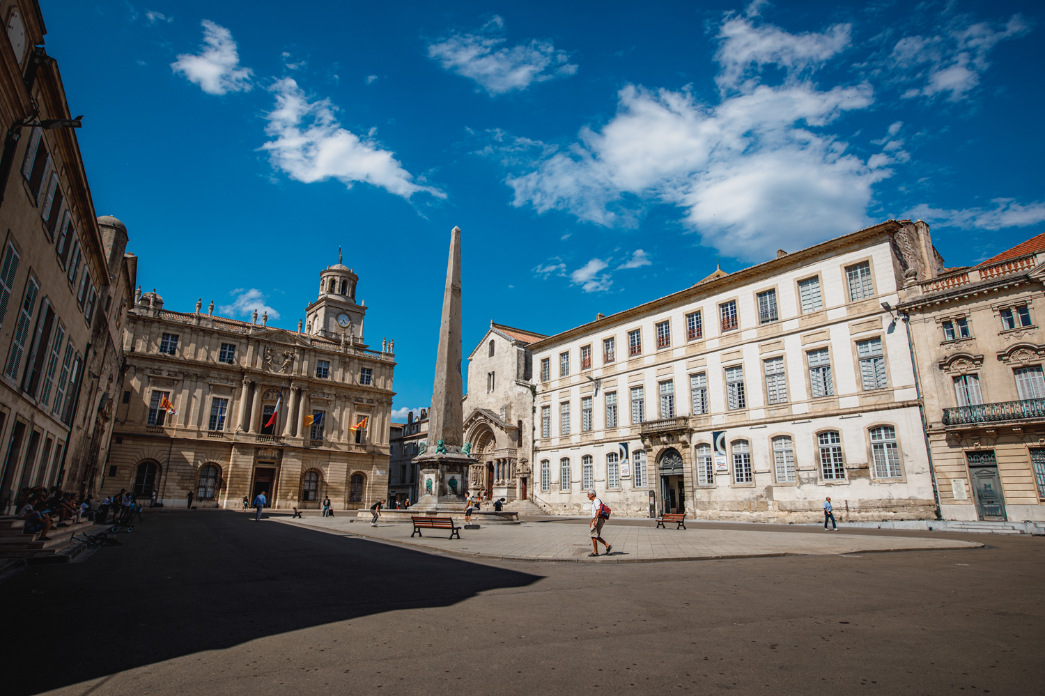 Located to the south of the ancient Roman forum, the Place de la République has marked the true heart of the city of Arles since the construction of the town hall in the 17th century, when it was still called Place Royale. On this square, in front of the new town hall, the consuls decided to erect an obelisk to the glory of King Louis XIV. The monument, 50 ft (15.26 m) high and 5.5 ft (1.70 m) wide at the base, was carved out of granite from a Roman quarry in Asia Minor in the 4th century. Rediscovered in ancient ruins in the 14th century, it rests on a 14.9 ft (4.55 m) high pedestal.