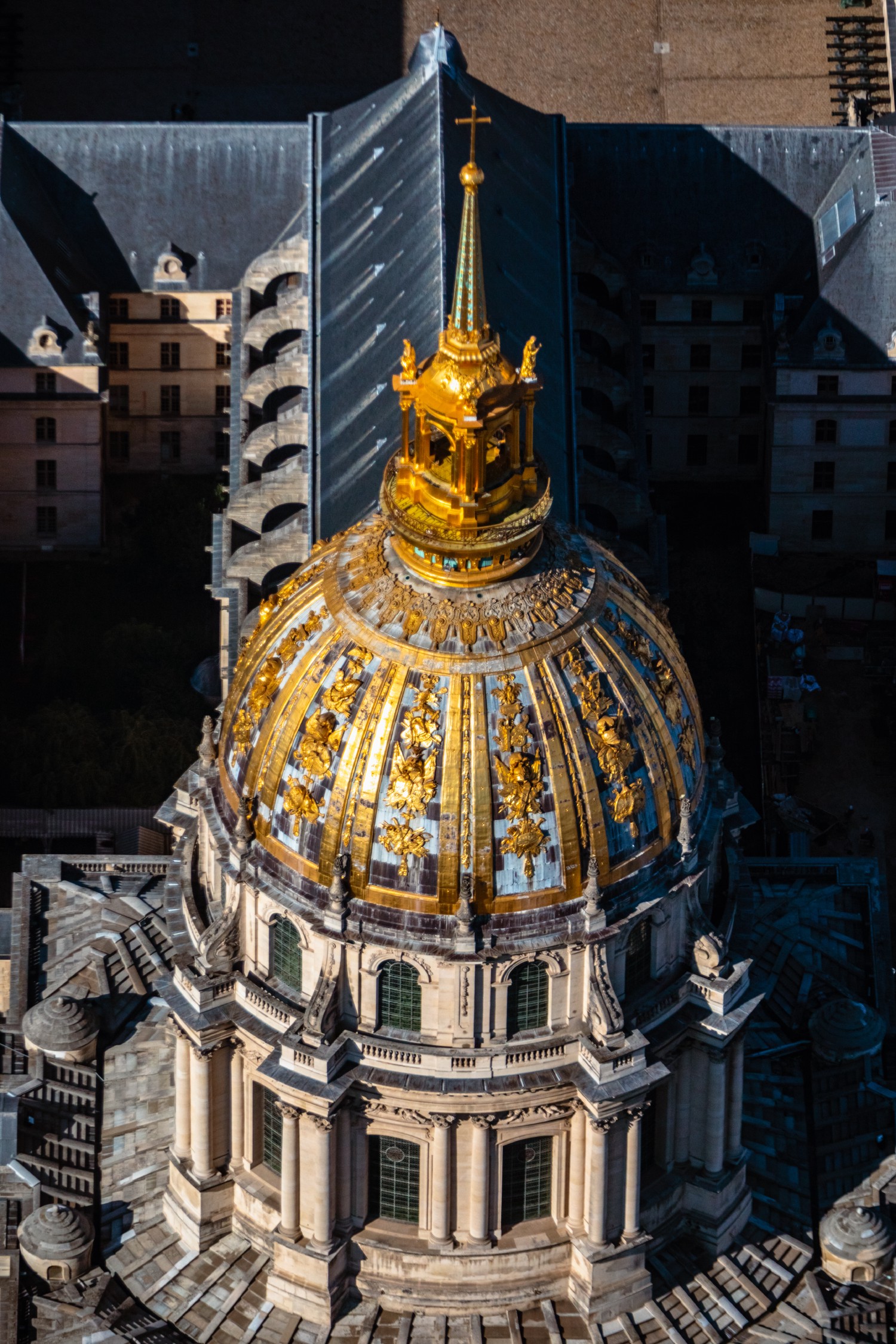 The Dome of the Royal Chapel of the Invalides is made of wood covered with lead. Completed in 1708, it consists of 12 compartments decorated with military trophies, gilded with gold leaf. The dome was redecorated in 1766, during the first Empire in 1807, then in 1869, 1937 and for the last time in 1989, on the occasion of the bicentenary of the Revolution. From 1869 onwards, the gilding process – which required twelve kilos of gold – was carried out by electroplating. The impression of lightness of the dome is accentuated by the quartered pattern of the roof, whose gilding emphasises and guides the eye to the cross.