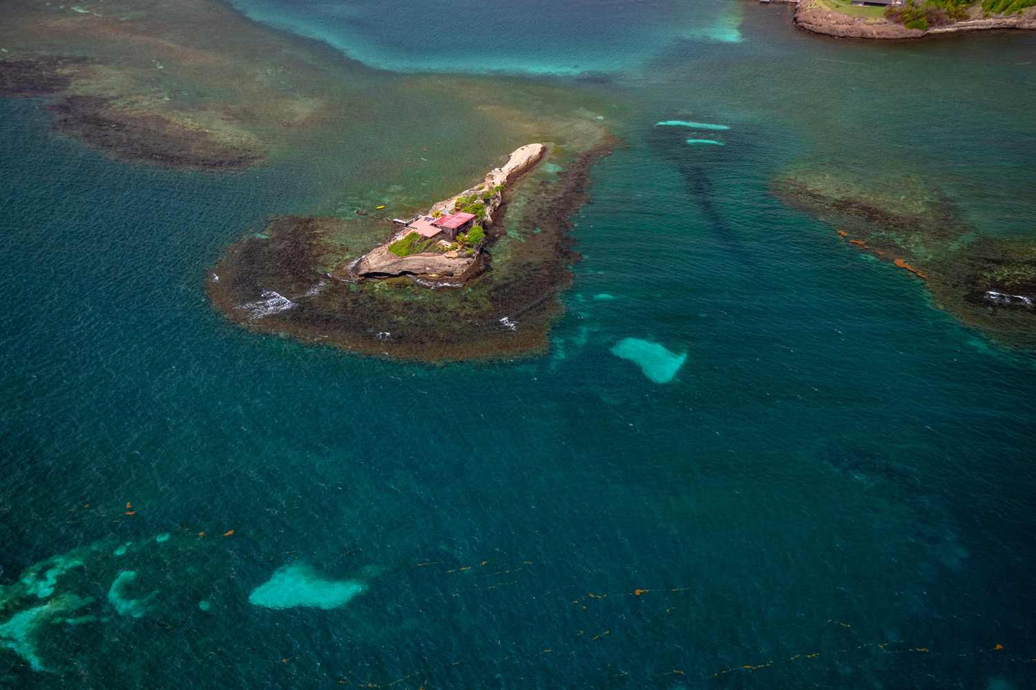 Pelé islet owes its name to its dry, very rocky, and almost devoid of vegetation soil. It is part of an archipelago of eight islets in Baie du François, on the Atlantic coast of Martinique, and is located south of Pointe Duplessis and Thierry islet, in alignment with Long islet. Triangular, the volcanic and rocky Pelé islet (0.6 acre / 0.25 ha) extends over a length of 429 ft (131 m) and a width of 111 ft (34 m). Flat, it rises 13 ft (4 m) above the ocean. It is formed of a set of coarse hyaloclastites (lava solidified on contact with water) probably from eruptions of neighboring islets. Highly threatened by marine erosion, Pelé islet is the subject of a program to re-vegetalize its soil by planting grasses, shrubs, and dynamic tree formations.