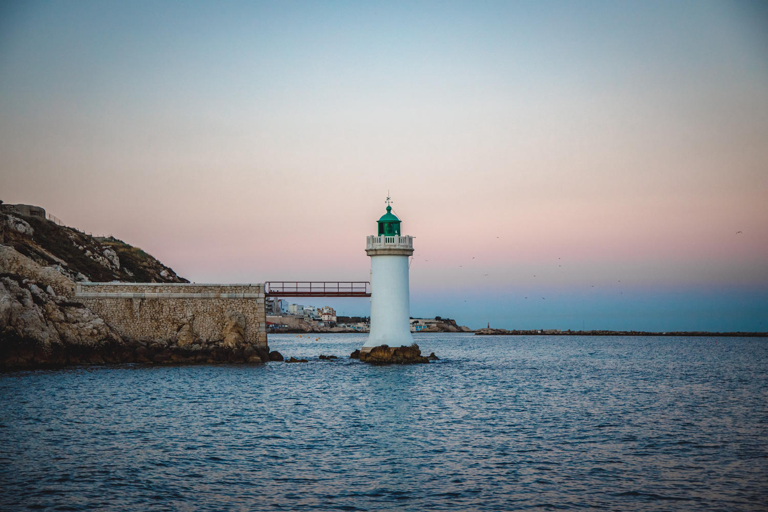 The discreet La Désirade lighthouse has marked the southern entrance to the Vieux-Port (Old Port) of Marseille for nearly 140 years. Located off the rocks of the Pointe du Pharo, it was built in 1881 in symmetry with the Sainte-Marie lighthouse of 1855. Its 42 ft high (12.80 m) masonry tower is equipped with an automatic light first operated on April 15, 1881. Electrified on June 5, 1912, it flashes with a green light with a range of 9 nautical miles every 4 seconds.