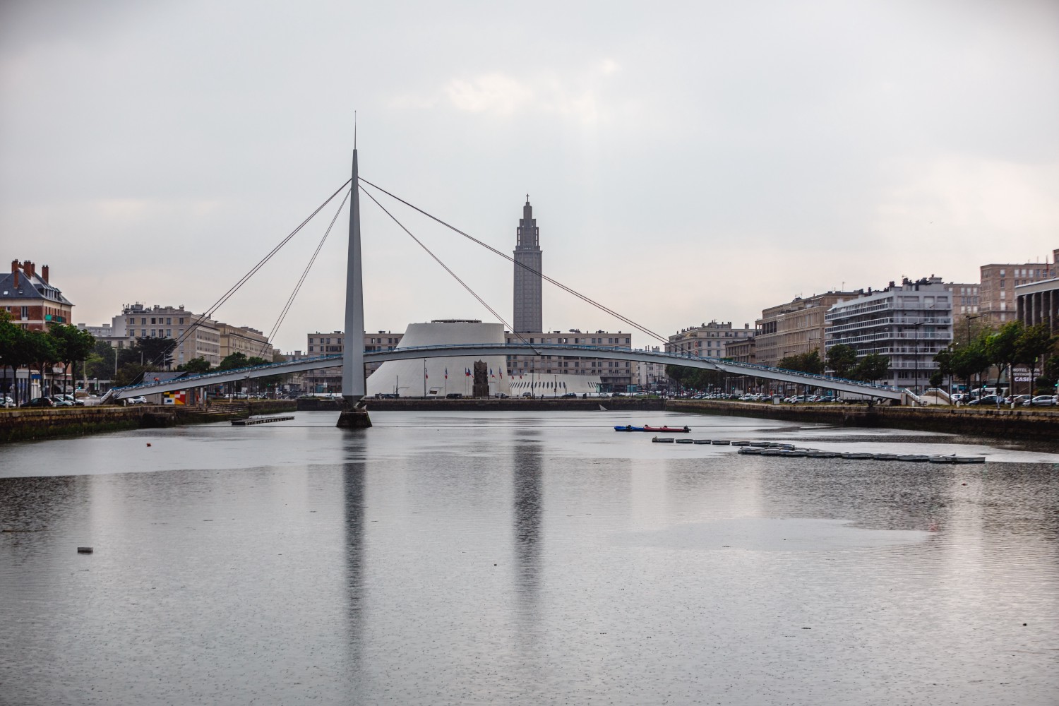 A first metal footbridge was built over the Bassin du Commerce in Le Havre in 1887, then replaced in 1899 by a footbridge with a metal deck. It became dangerous after the Second World War and was destroyed in 1963. In 1966, the architect Guillaume Gillet was commissioned to revive the footbridge of the basin. He designed an asymmetrical cable-stayed bridge that did not alter the perspective with Oscar Niemeyer's Maison de la Culture standing just behind.