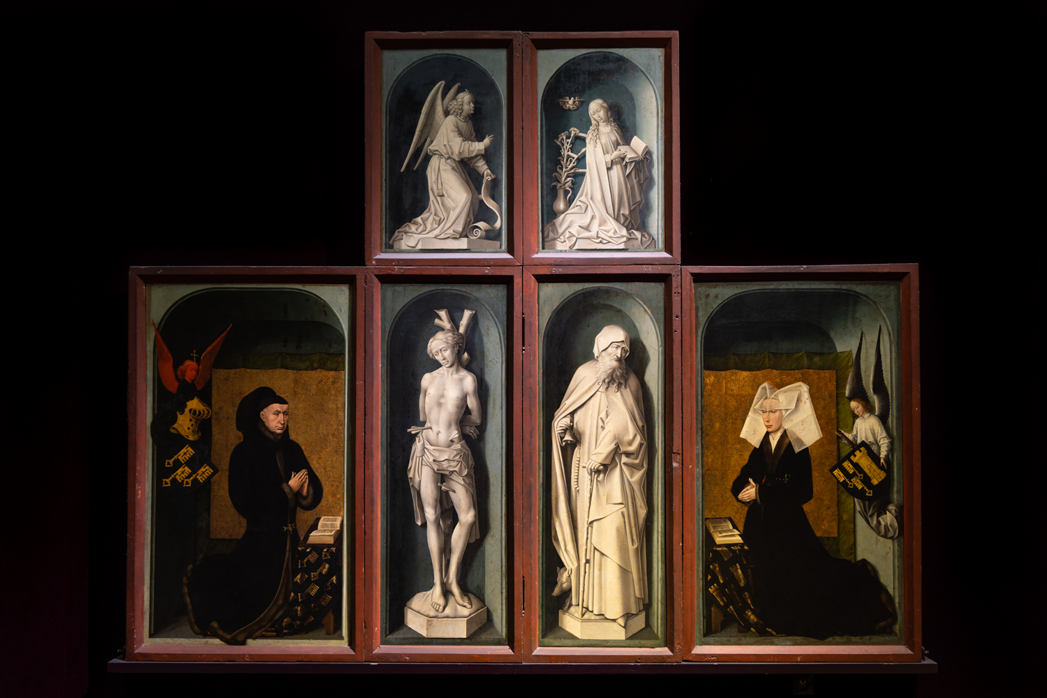 The polyptych of the Last Judgment commissioned by Nicolas Rolin, founder of the Hospices of Beaune, from the Brussels artist Rogier van der Weyden, hung above the altar in the chapel of the Grande Salle des Pôvres (Great Hall of the Poor). It was open to the sight of the sick only on Sundays and feast days. Closed, the altarpiece represents at each of its ends Nicolas Rolin and his third wife, Guigone de Salins, kneeling in prayer, facing each other. Between them are depicted in trompe-l'oeil four scenes of Christ on the Cross, the Annunciation, Saint Sebastian (patron of chivalry of Chancellor Rolin), and Saint Anthony (patron of the Hôtel-Dieu and Guigone de Salins) accompanied by his pig.