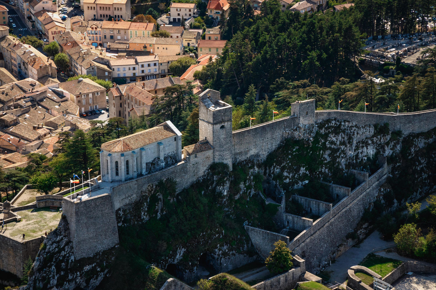 The chapel of the citadel of Sisteron, built in the 15th century in a late Gothic style, rises on a terrace carried by arcades resting on powerful pillars. It quickly lost its religious function and was transformed into a dungeon used from the 17th century as accommodation for the king's lieutenant, barracks, and prison. Rehabilitated in the mid-1930s, the chapel was bombed in August 1944 and rebuilt in 1970. Every year, on August 14, a mass is celebrated there in memory of the victims of wars.