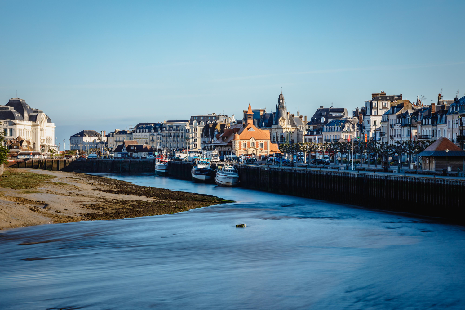 The municipality of Trouville-sur-Mer extends in the east of the Calvados department in the Pays d'Auge. It is implanted on the right bank at the mouth of the Touques, opposite Deauville, located on the left bank. Bordered by the Baie de Seine, Trouville is also a coastal town and a very popular seaside resort with 0.74 miles (1.2 km) of beach and boards. Seaside tourism, fishing, and thalassotherapy are its main economic activities.