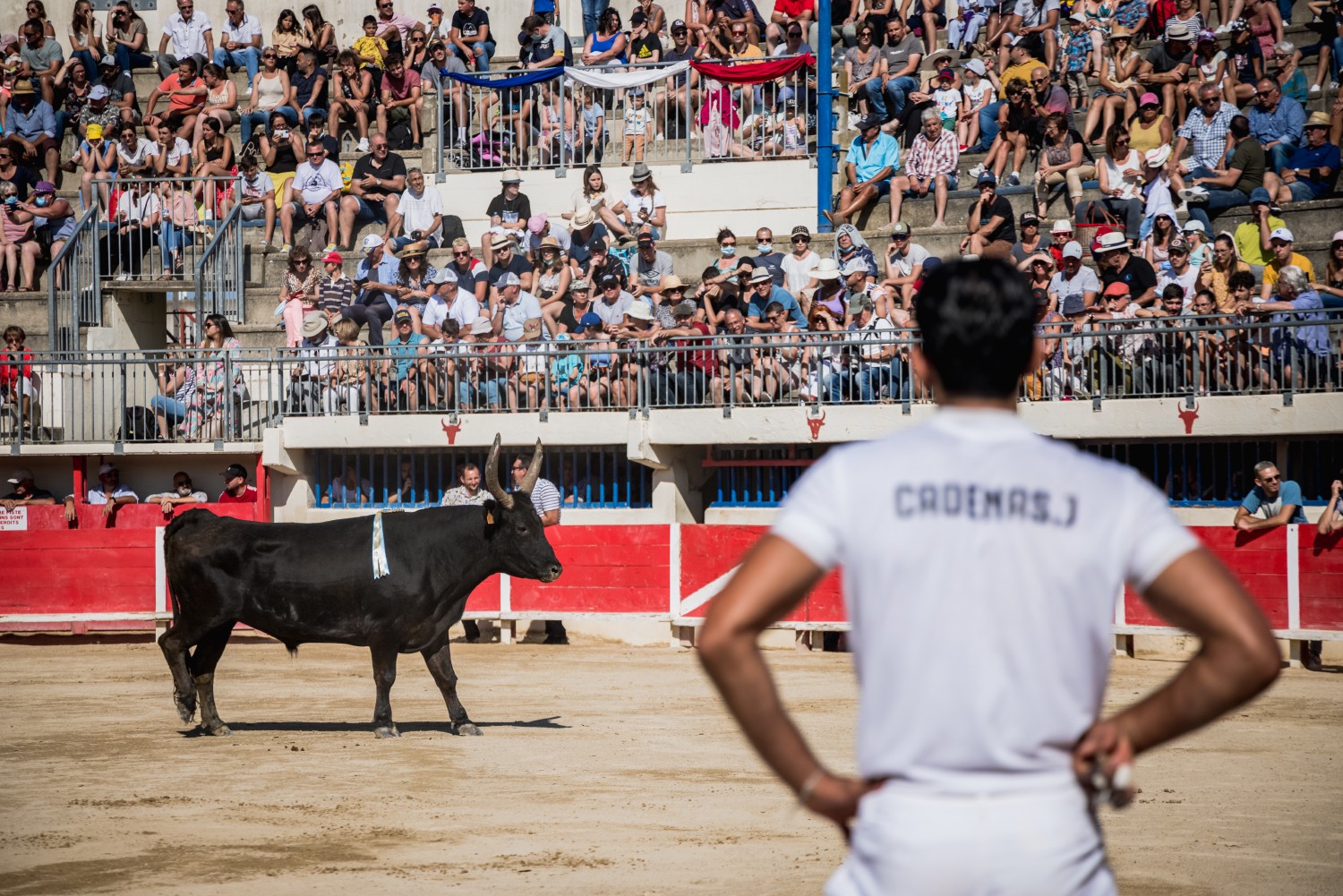 During a standard Camargue race, six cocardiers bulls follow one another in the center of the track. The event takes place in two steps divided between a first part with the passage of the first three bulls, a fifteen-minute intermission, and the entrance of the remaining bulls. Depending on its behavior on the track and its character, each animal has a predefined running order. The entrance is signaled by a first blast of the trumpet, and the bulls stay for a maximum of fifteen minutes after the president announced their names and the herd to which they belong. The animal benefits from one minute to familiarize itself with the surroundings of the arena before a second trumpet announces the entrance of the raseteurs and tourneurs on the track. From then on, the participants try to catch the attributes attached to the bull's head. The animal returns to the toril when the time is up of if its attributes have all been removed.