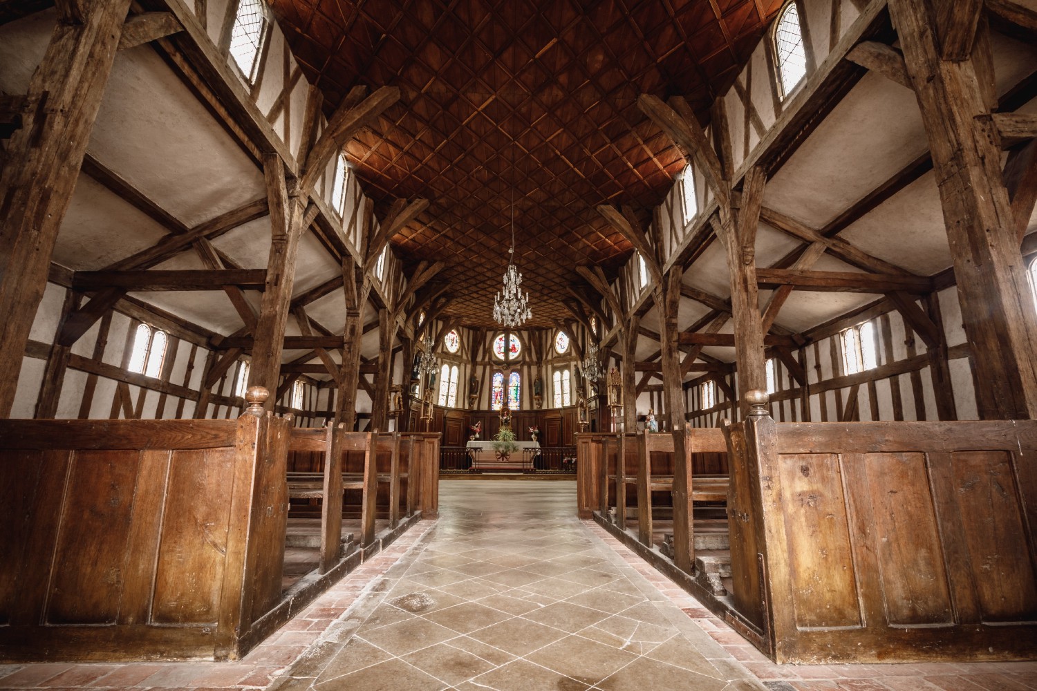 The central aisle of the Saint-Jacques-et-Saint-Philippe (St. James and St. Philip) church in Lentilles (Aube) is very original. The solid oak beams rise up to the ceiling, which is also made of wood, and is made of panelling decorated with diamond-shaped lugs. The interior walls show the cob in its raw state without any paint or ornamentation. The walls, interspersed with wooden beams, anchor this church in the style of the region. Here, the builders built their churches with timber framing, just like their houses. A quick and cheap method of construction.