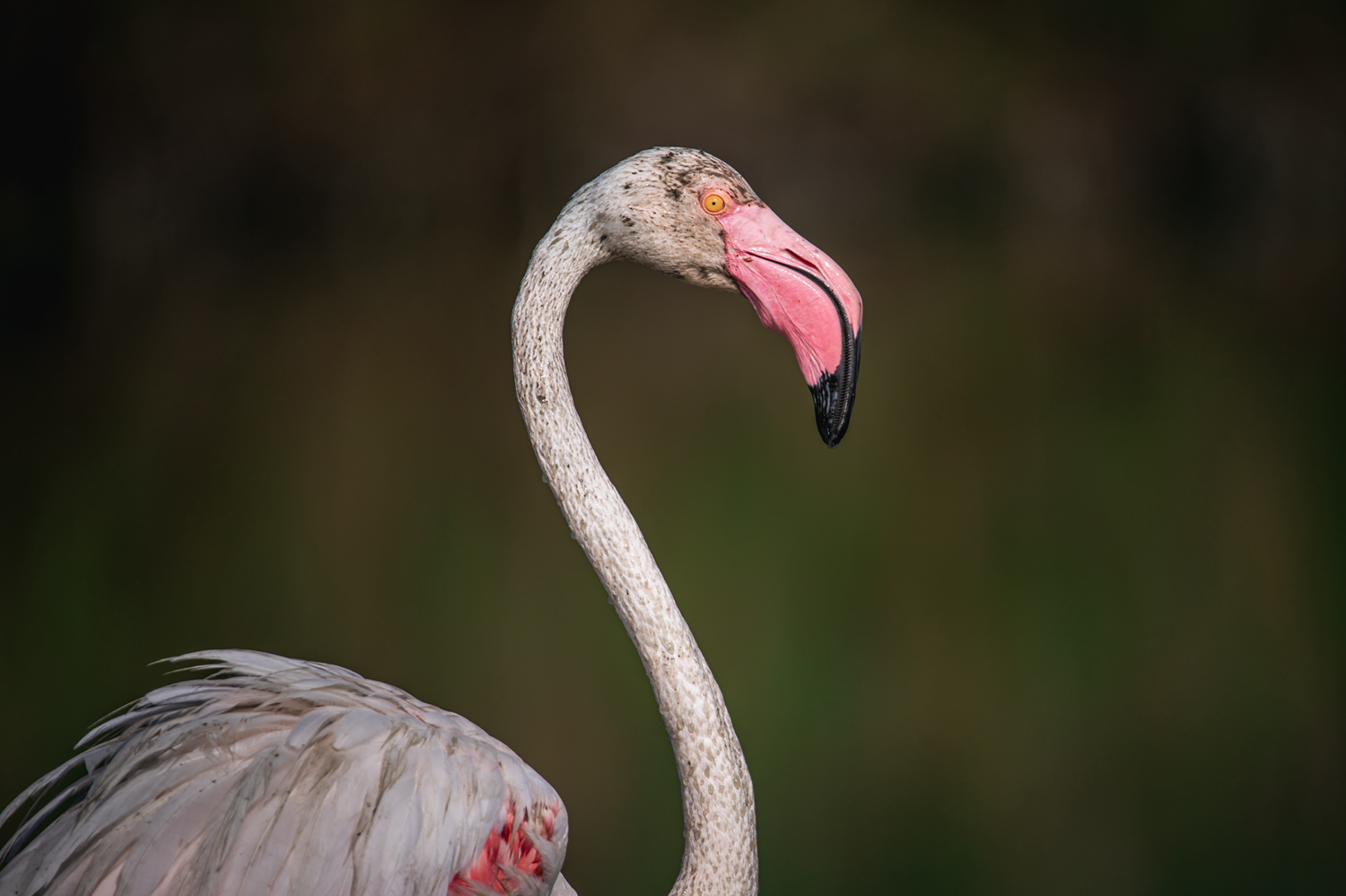 The pink and black curved beak characteristic of the greater flamingo (Phoenicopterus roseus) is the prerogative of adulthood and an essential tool for filtering its food. The flamingo, born entirely covered with a white-gray down and a tiny and straight beak, acquires it as it grows. It is nourished by regurgitation of a liquid rich in glucose, albumin, and lipids secreted by its parents' digestive glands until the age of one month, the moment it begins to find its sustenance on its own. Able to fly around 70 days old, it then leaves the assemblies of flamingos of its age gathered in nurseries.