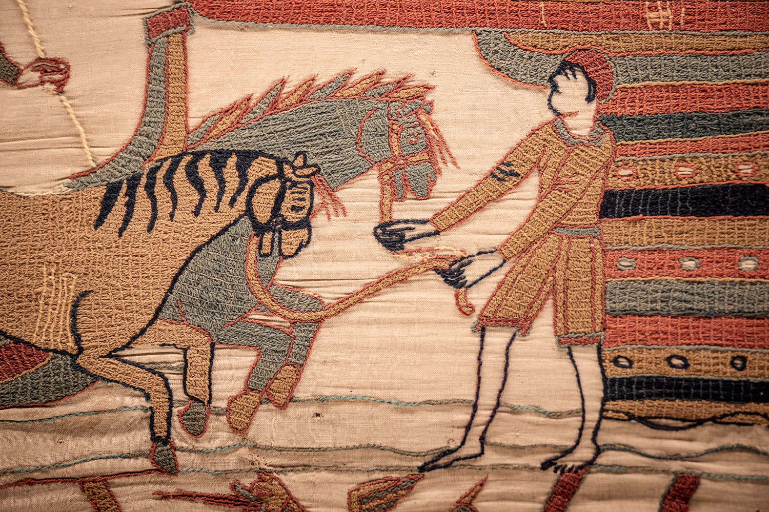 From vegetable dyes, the woolen threads of the Bayeux Tapestry were dyed in five dominant tones: brick red, green-blue, old gold, olive green, and blue. The embroidery provides a thorough description of everyday life at the time of Duke William of Normandy and depicts buildings, furniture, clothing, tools, weapons, etc. This piece of secular Romanesque art from the Middle Ages has significant documentary value for the knowledge of the Norman and English 11th centuries.