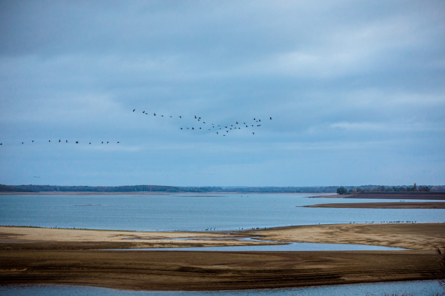 The Lac du Der-Chantecoq in the Champagne region of France has become one of the main sites for the resting of Common Cranes (Grus grus) in Western Europe. As a proof, the year 2019 has beaten the world record for the concentration of Common Cranes, which dated back to 2014: 268,120 individuals were counted on the Lac du Der on 3 November. Some do not continue their migration and choose to winter around the lake. As soon as the sun begins to decline, the cranes that have left to feed in the vicinity return to the lake for the night, in noisy groups, in a very orderly V formation.