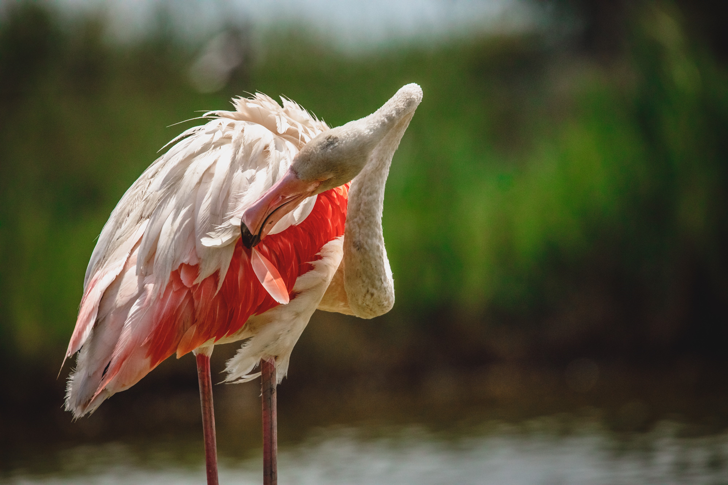 Greater flamingos (Phoenicopterus roseus) parade in winter after their pre-nuptial plumage molt, which starts in June/July and ends in October/November. Their new feathers then exhibit vibrant colors that are decisive in the choice of their new mate for the nesting season to come. At the peak of their coloring and seduction, they, therefore, devote themselves to the ritual courtship displays that allow mating.