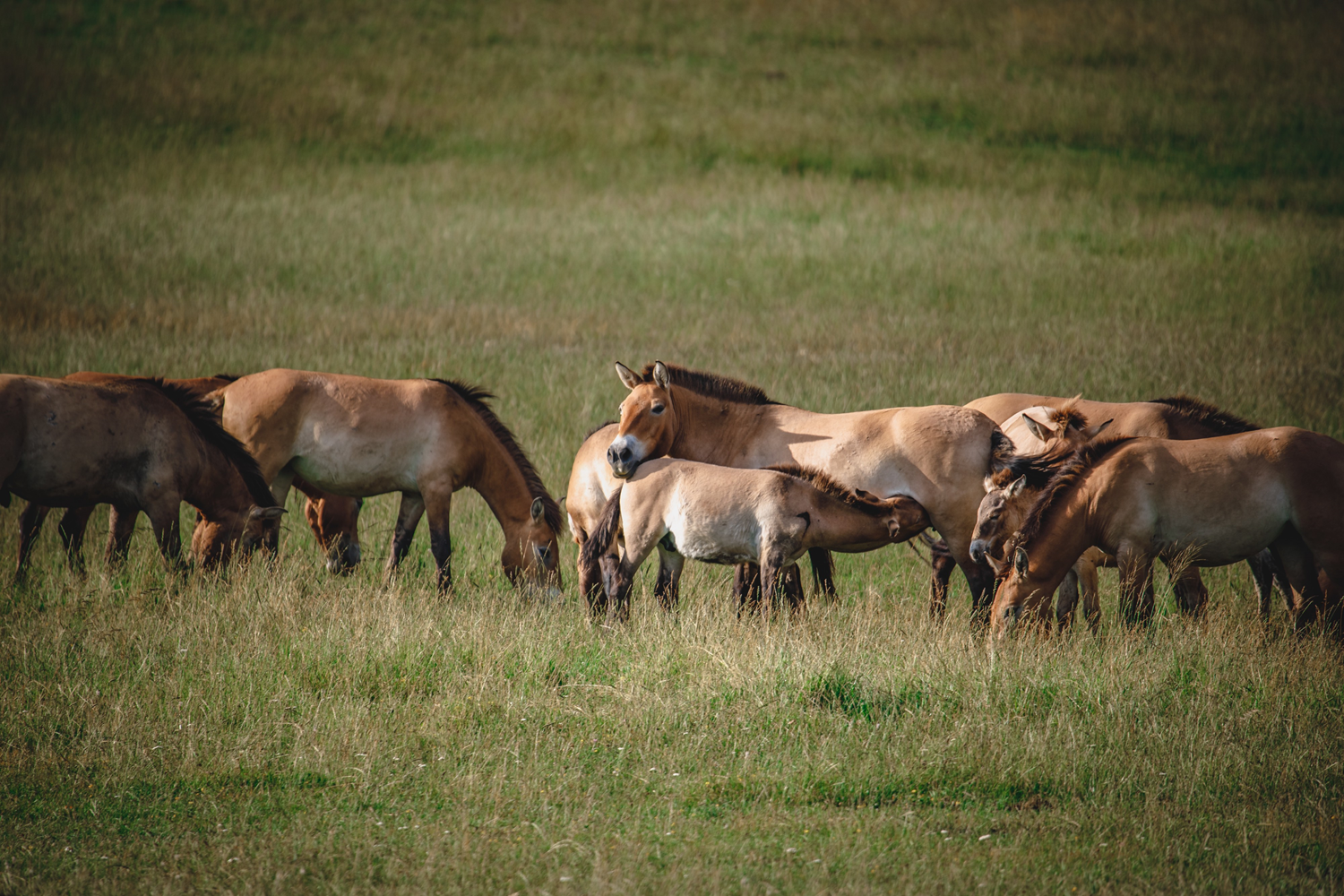 The Przewalski foals and fillies nurse for about six months, initially suckling every half hour before starting to graze one month after their birth. To develop the colonies of intestinal bacteria which will facilitate the digestion of cellulose, they consume some of their mother's feces in their first days of life.