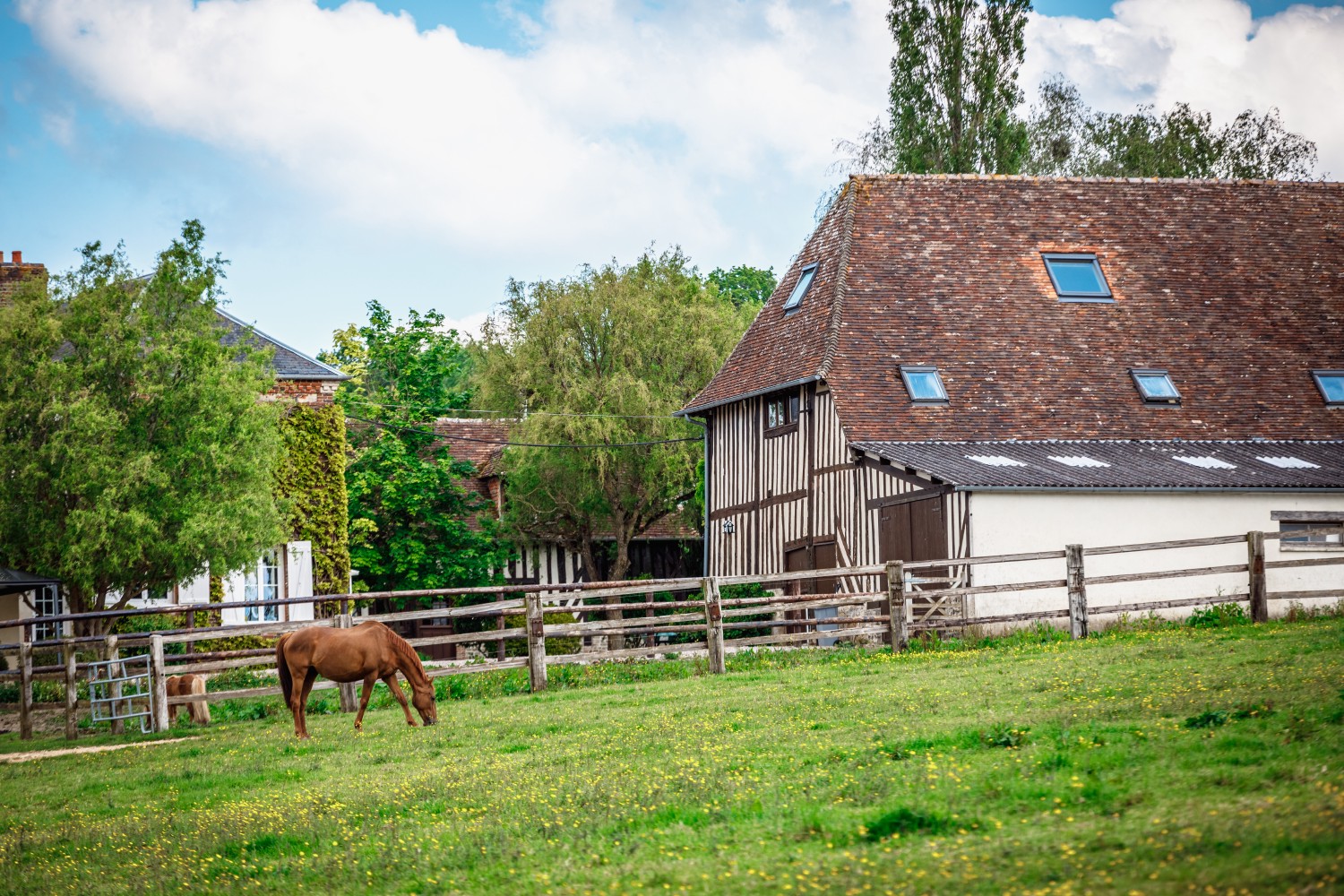 The concentration of sport and blood horses is particularly important in the stud farms and breeding farms in Lower Normandy, such as here at the Haras des Étincelles (Étincelles stud farm) in Mesnil-Simon in the Calvados department. Calvados, Orne, and Manche are the three largest horse-producing departments in France. Calvados ranks first for Thoroughbreds, Orne for Trotters, while the Manche department dominates the Selle Français sector. The three categories respectively had 4,200, 3,900, and 2,900 births in 2017.