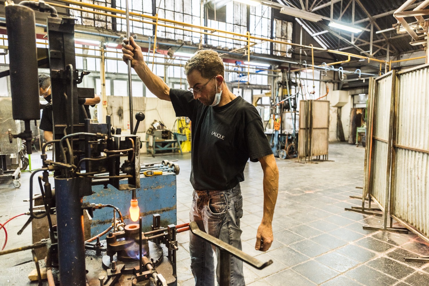 Once the glowing crystal mass is attached to the rod, it is shaped by the glassblower with a short blast and rotating movements of the rod. It is then inserted into a cast iron or steel mould heated by a blowtorch. This method makes it possible to produce series of models with relief patterns – in this case stemware – more quickly. The blowtorch keeps the crystal mass at a high temperature during the casting process. In 1909, René Lalique perfected this technique and filed an industrial patent.