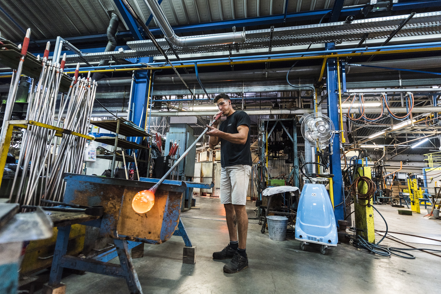 The technique of glassblowing is attributed to the Syrians around 100 BC, thanks to the invention of the blowing rod. At Lalique, the glassblower, equipped with a long hollow metal cane, takes the molten crystal from inside the furnace. In order for the viscous material to adhere to the rod, it must reach a temperature of approximately 2,190°F (1,200°C). Depending on the volume of the piece to be made, the blower has to collect up to 44 lb (20 kg) of molten mass at the end of his rod. Blowing glass or crystal requires a great deal of lung capacity, as the blow must be regular and continuous until the desired shape is obtained.