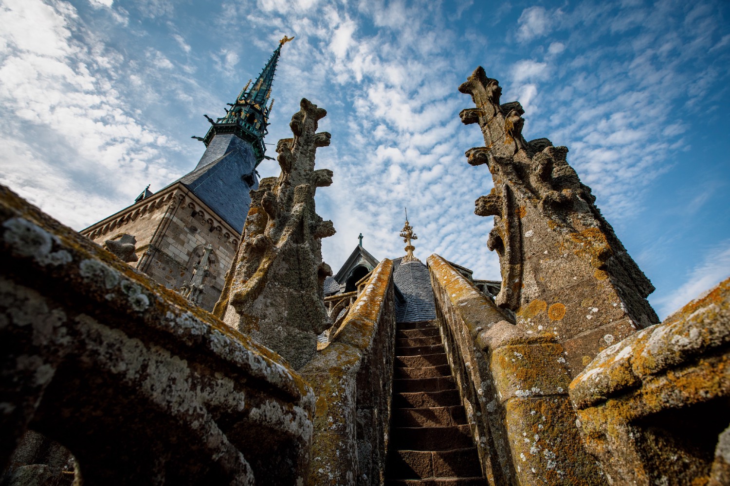 You have to climb a hundred steps before arriving on the terraces of the choir. There, at the foot of the flying buttresses that support the choir of the abbey, the view is already impressive. Below: the village and its tiny visitors. Above, pinnacles on which the gulls nest, Gothic sculptures, gargoyles. The lucky ones may be able to join the lace staircase because it can't take more than ten people. This staircase is a real masterpiece. Its ramp is finely carved in granite and in a remarkable flamboyant Gothic style. At 110 meters high above the sand, it's a bit like being familiar to the angels.