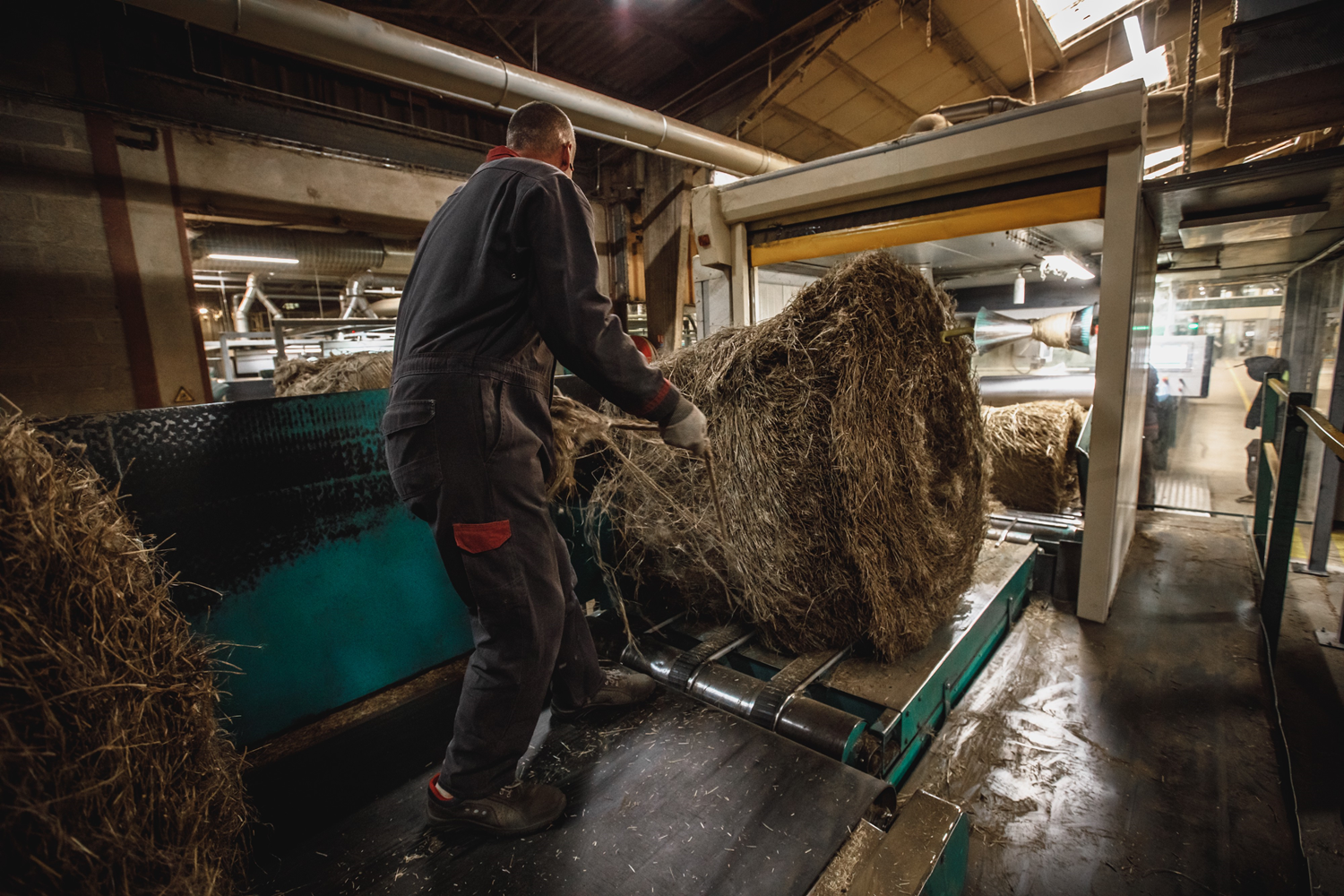 Soon after harvest, the flax straws arrive on the scutching line. The bales are unrolled, and the straw is placed in homogeneous layers. Flax is crushed, beaten, and stripped of its gangue of straw and wood. The remaining blond fibers are combed with ever finer combs to eliminate all the small pieces of straw left and separate the fibers between them. The scutching inaugurates a long process resulting in golden ribbons, thin as hair, which make the reputation of Normandy.