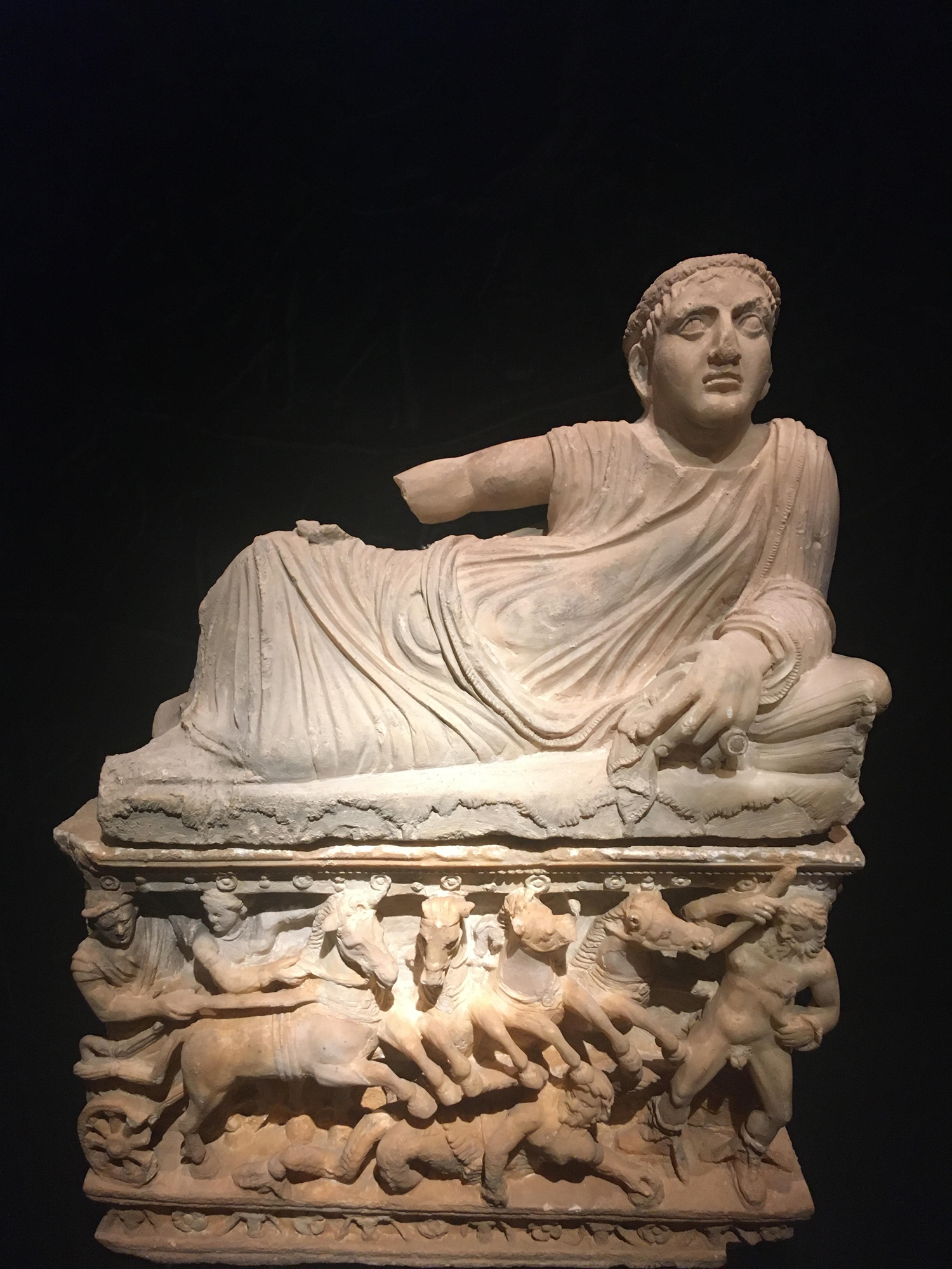 Urna cineraria etrusca con un difunto transportado en carro (siglo II a.c. En el MARC de Alicante)