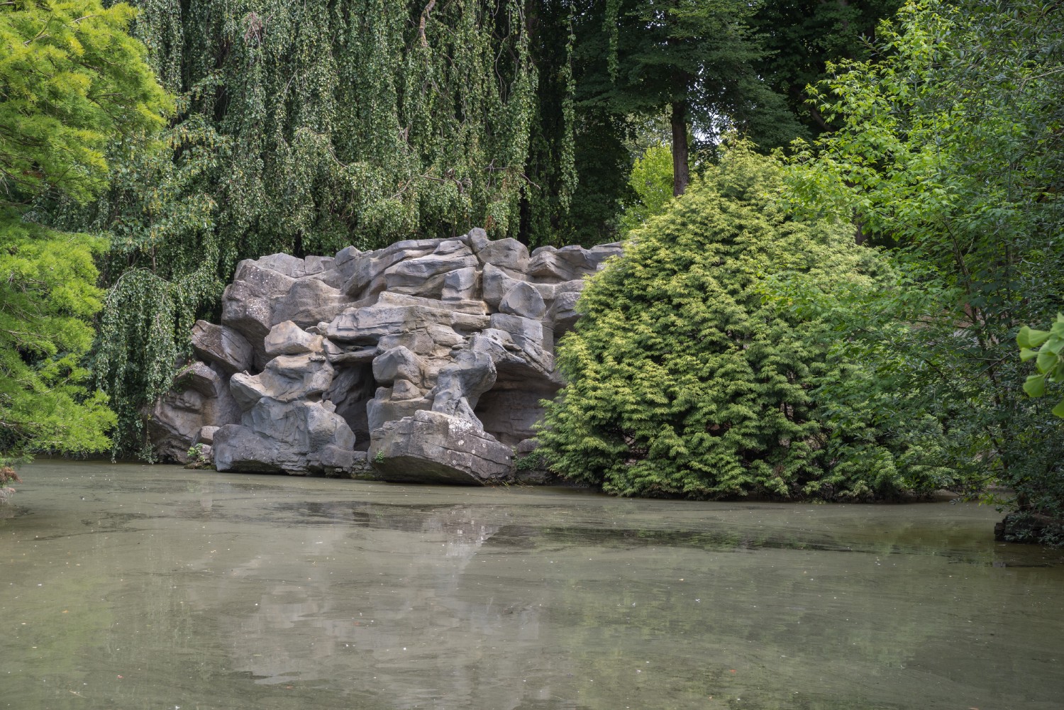 Le lac et le rocher du jardin de la Rhônelle.