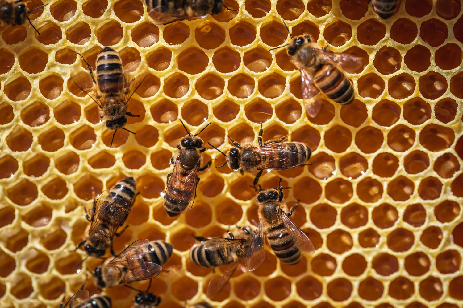 Alveoli are very thin-walled cells composed of wax (90%), propolis, and pollen (10%) built by wax bees from mid-March to mid-July. Used by the bees to store honey, brood, and pollen, their perfect hexagonal shape constitutes a deformation of their original circular build. Under the effect of heat, which can go up to 113°F (45°C) inside the hive, and in accordance with the principle of viscoelasticity, the cells compress together, the wax melts, and angles begin to form mechanically.