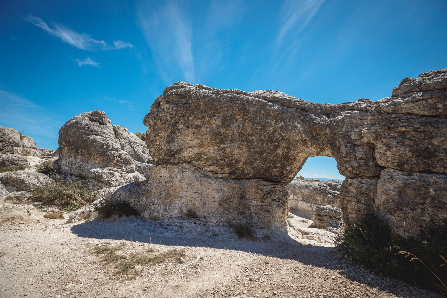 The strange rocks of Mourres (snout in Provençal) are geological formations several meters high located 1.7 miles (2.8 km) from Forcalquier in the direction of Fontienne, on either side of the departmental road. These spectacular limestone masses with unusual shapes of undulations, mounds, haystacks, cylinders, or basins are spread over the vast eponymous plateau that slopes slightly towards the southeast.