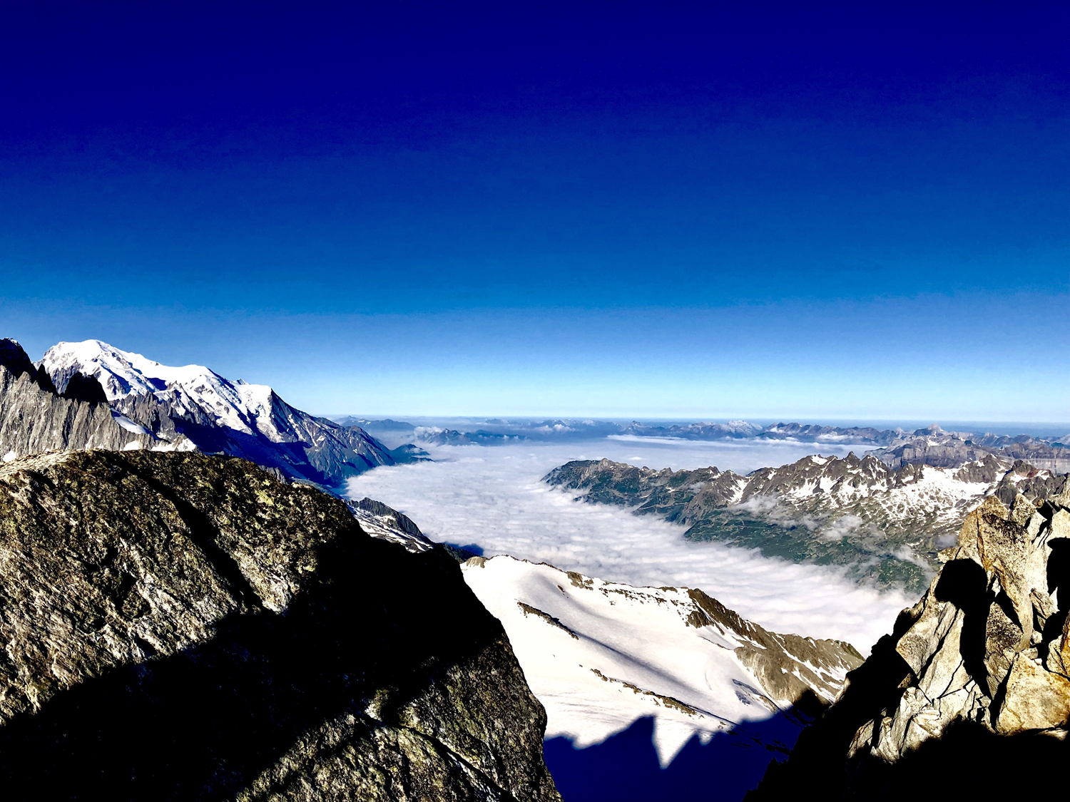 La vue depuis l’aiguille du Tour 3542m en direction du Mont Blanc. Chamonix est encore sous les nuages, mais le ciel se dégagera le temps que nous redescendions.