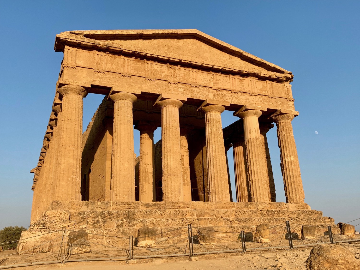 A Agrigente, dans le sud de la Sicile, se situe la vallée des temples, vestige de la colonisation de l’île par les Grecs au Vème siècle avant JC. Ce temple est celui dédié à la déesse Concordia, construit au IIIème siècle avant JC. Le temple a ensuite été transformé en basilique chrétienne par les Romains, ce qui explique sûrement son excellent état de conservation.