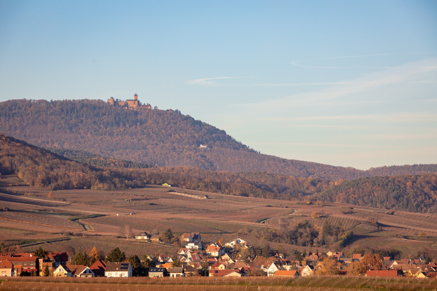 The Haut-Kœnigsbourg castle overlooks the whole Alsace plain between the Vosges mountains and the Black Forest. During the Middle Ages and the Renaissance, it monitored the commercial road that extended at its foot, near the village of Orschwiller. It already existed in Celtic and Roman times, as attested by a landmark that still stands at the exit of the locality. Nowadays, no threat weighs upon the Wine Route that crosses Alsace.