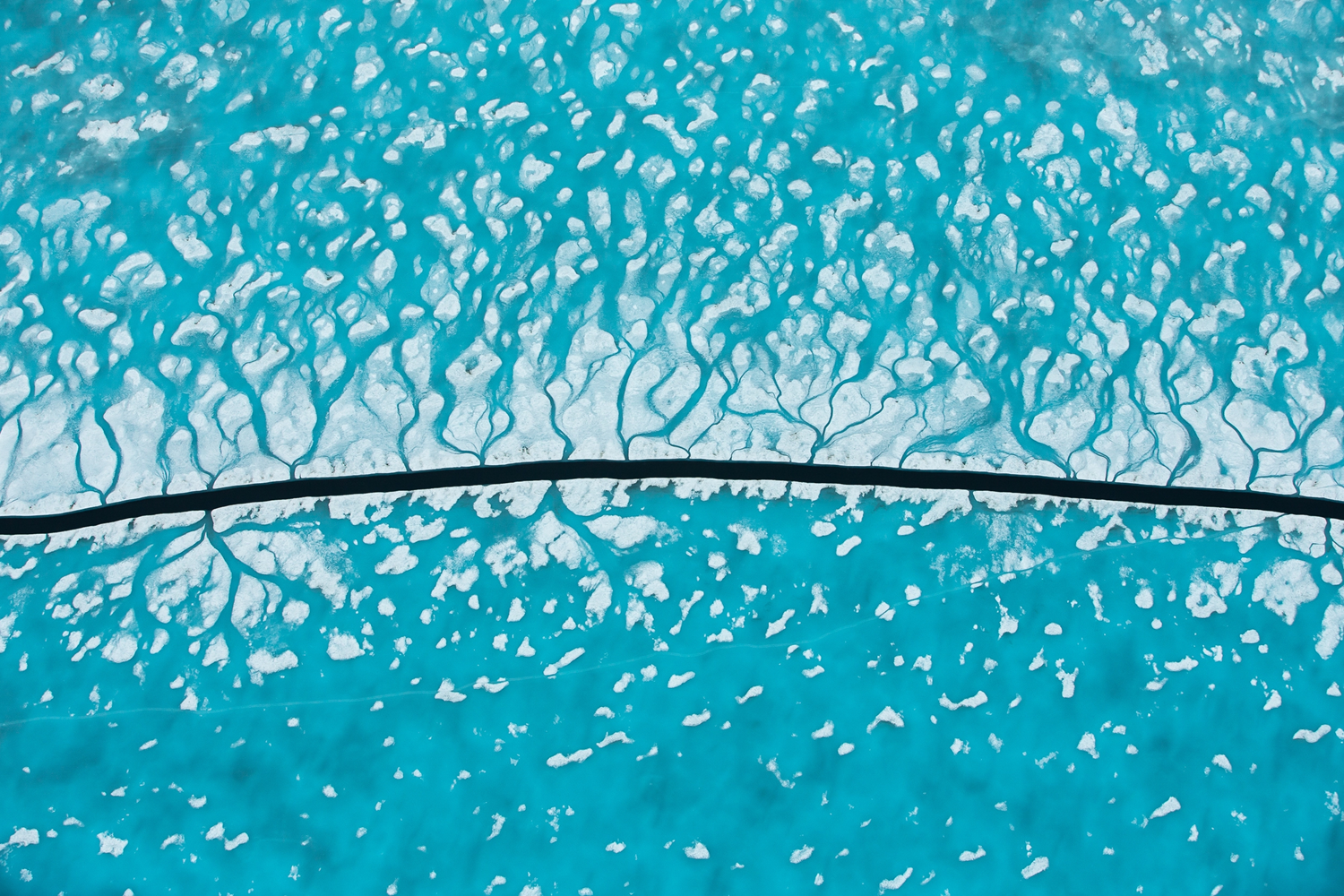 Aerial focus on an open water lead in the Canadian Arctic Archipelago sea ice. Channels of the Canadian Arctic Archipelago form the shortest passage between the Pacific Ocean and the Atlantic Ocean. The Northwest Passage is the main navigable route. The sea ice completely covers the Arctic Archipelago waters in winter, making navigation impossible except for icebreakers which are used to keep trade routes open. The sea ice melts and breaks up in spring.
