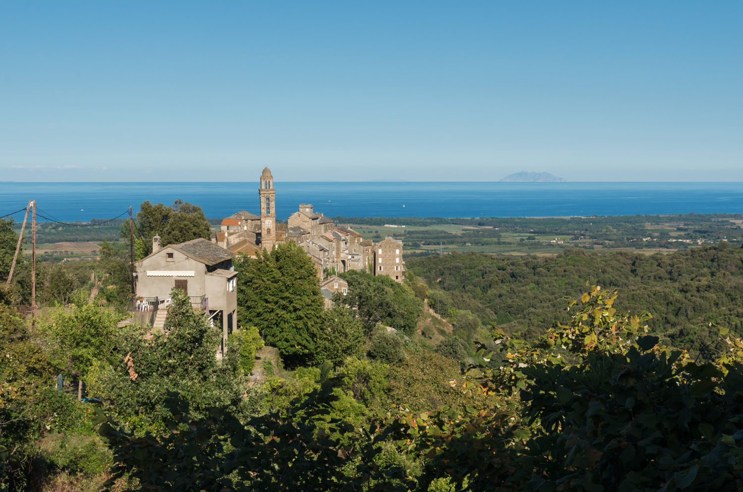 Vue de Venzolasca depuis l'ancien couvent Saint-François d'Assise (Cunventu San Francescu). Au loin l'île de Montecristo.
