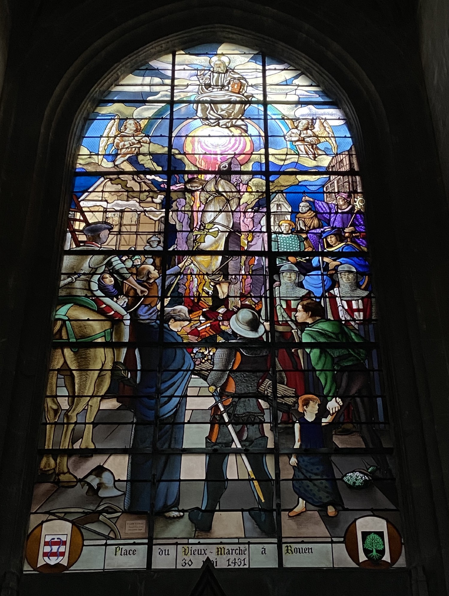 Le vitrail illustre la journée du 30 mai 1431, où Jeanne d’Arc est brûlée vive sur la place du Vieux Marché à Rouen.