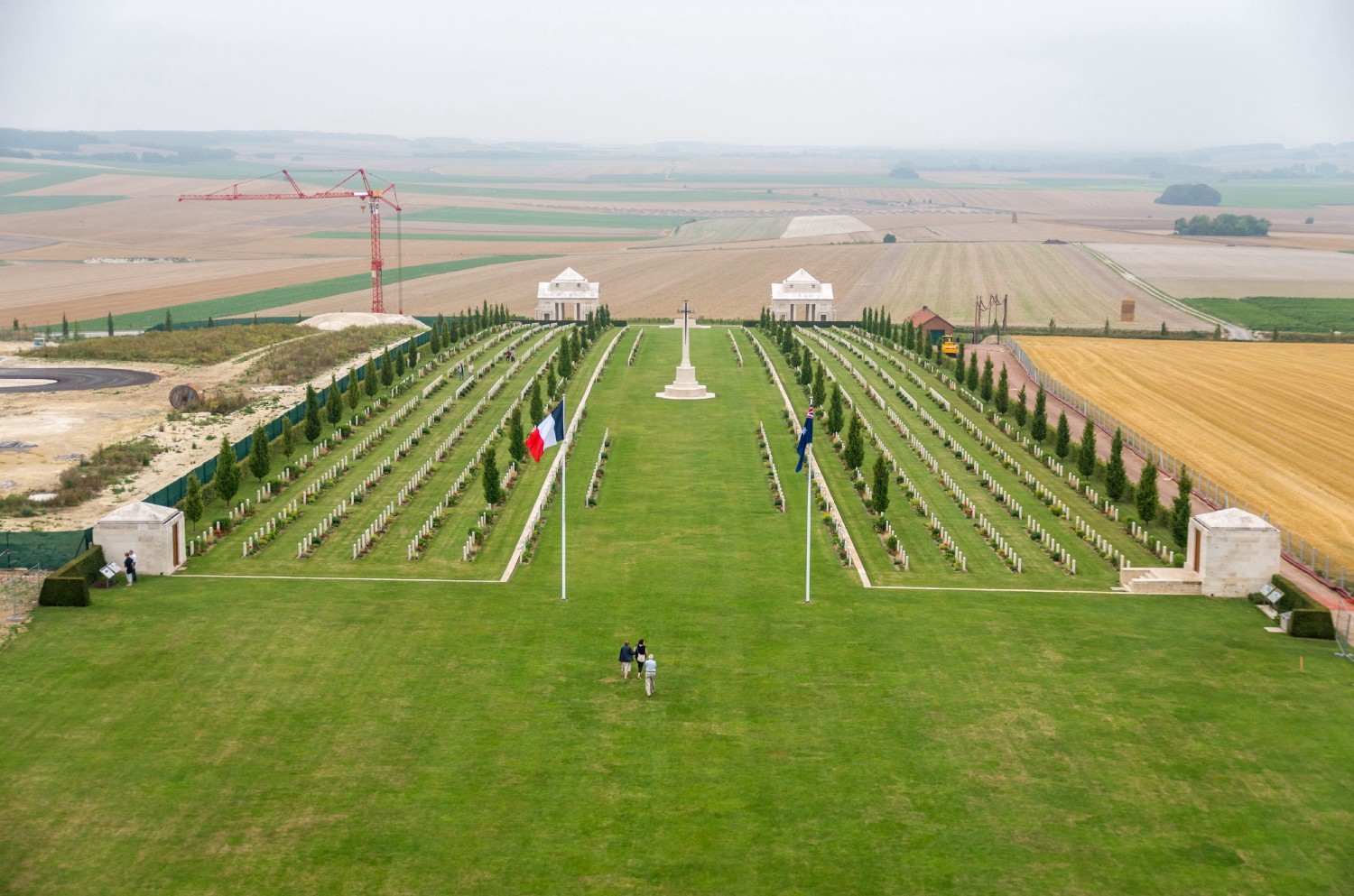 Mémorial national australien de Villers-Bretonneux. Le cimetière militaire et les pavillons depuis la Tour du Souvenir